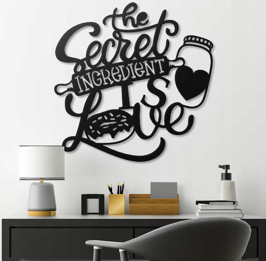 Dekoracja przedstawia napis w ozdobnym stylu: „The secret ingredient is love”. Towarzyszą mu rysunki – wałek do ciasta, słoik z sercem oraz donut, które podkreślają kulinarny charakter motywu. Całość została zaprojektowana w lekkiej, zabawnej formie, nawiązującej do idei, że najważniejszym składnikiem każdej potrawy jest miłość.