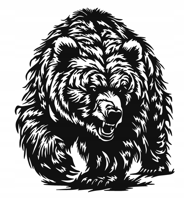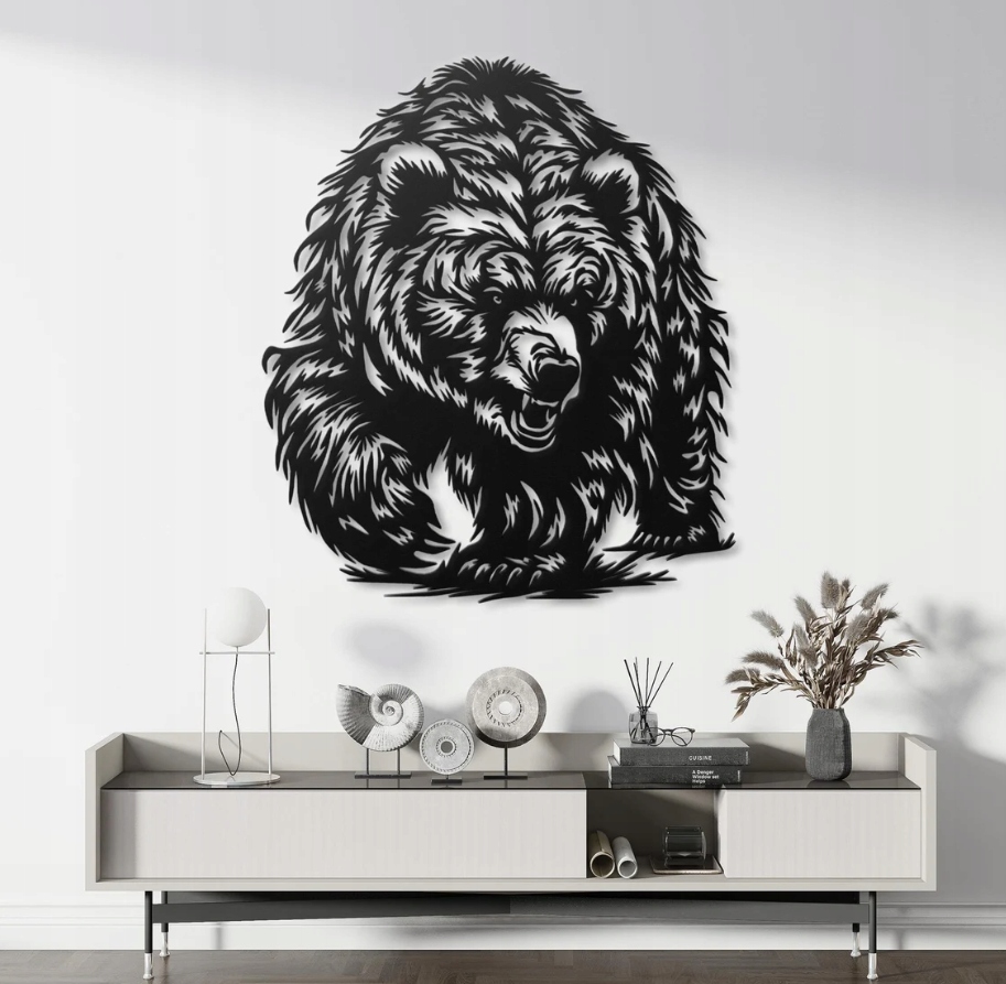 Dekoracja przedstawia potężnego niedźwiedzia w dynamicznej pozie, z otwartym pyskiem i przenikliwym spojrzeniem. Mocne kontrasty oraz precyzyjne linie podkreślają gęstą sierść i siłę zwierzęcia, nadając kompozycji realistyczny, a jednocześnie artystyczny charakter. Całość emanuje energią i potęgą natury, przyciągając uwagę swoją intensywnością.