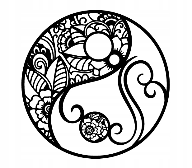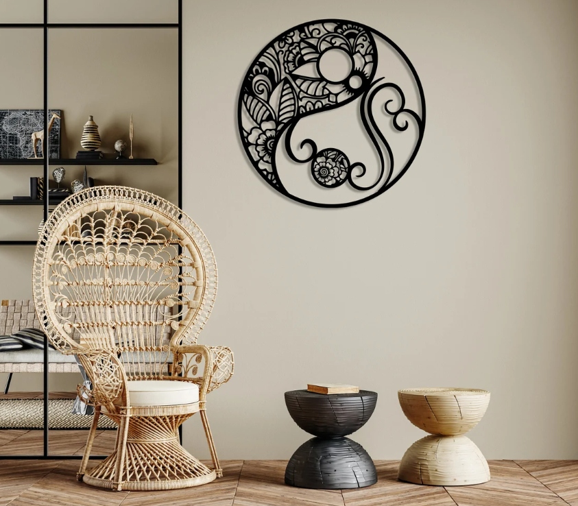 Dekoracja przedstawia harmonijne połączenie motywów roślinnych z geometrycznym kształtem okręgu, tworząc efektowne zestawienie natury i symetrii. Kwiaty, liście oraz finezyjne linie wpisane w symboliczny układ nadają całości elegancji i spokoju. Cienkie kontury i bogate zdobienia sprawiają, że dekoracja zyskuje lekkość, mimo dużej ilości detali, a wzór przyciąga uwagę subtelną równowagą między dynamiką form a ich uporządkowaniem.
