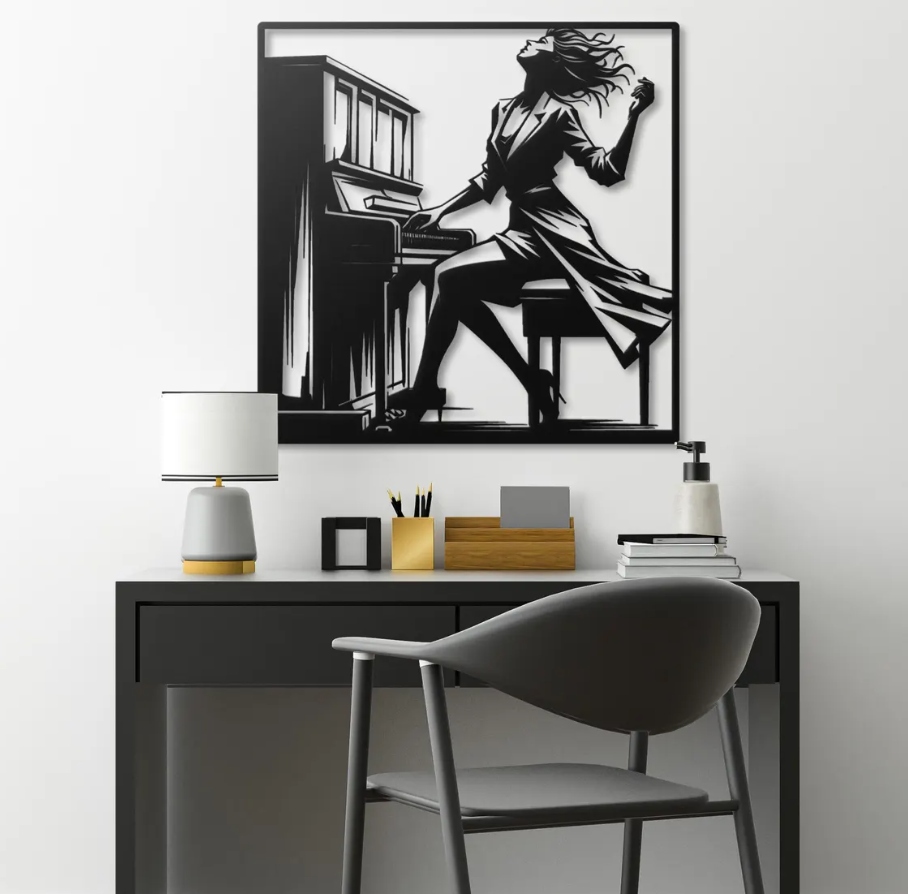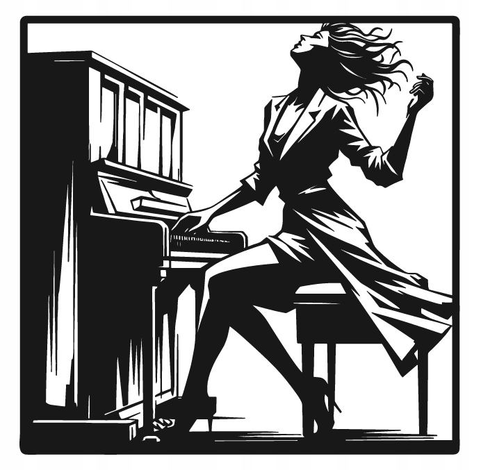 Dekoracja przedstawia kobietę grającą na fortepianie, ujętą w dynamicznej pozie pełnej ekspresji i emocji. Falujące włosy i lekko rozwiany płaszcz podkreślają ruch, a kontrastowe linie nadają kompozycji głębi oraz artystycznego charakteru.