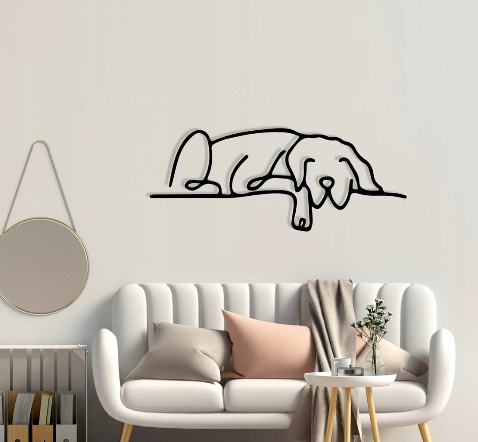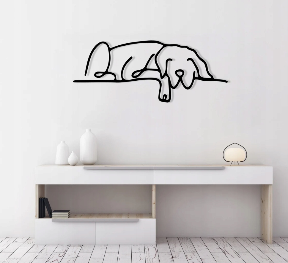 Dekoracja przedstawia psa leżącego w spokojnej, zrelaksowanej pozie, ujętego w formie minimalistycznej linii. Prosty i delikatny wzór sprawia, że motyw wprowadza do wnętrza ciepło i przytulność. Idealnie sprawdzi się jako ozdoba ścienna w domu miłośników zwierząt – szczególnie w salonie, sypialni lub przedpokoju, nadając przestrzeni domowego charakteru i harmonii.