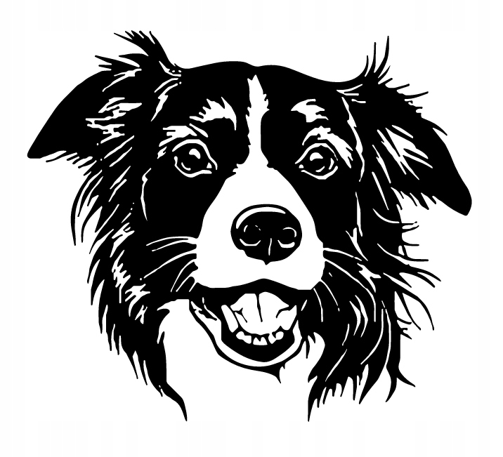 Na obrazku znajduje się uśmiechnięty pies przedstawiony w formie graficznej, czarno-białej. Jego pysk jest otwarty, widać język i zęby, co nadaje mu przyjazny i radosny wyraz. Oczy psa są pełne życia i energii, a uszy lekko uniesione, jakby był czymś zaciekawiony.