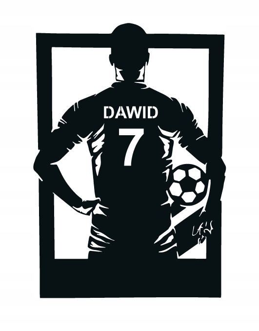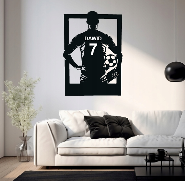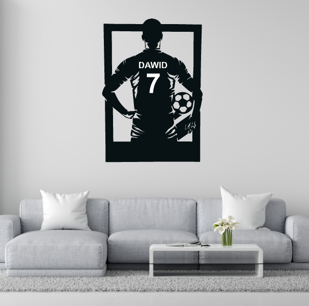 Dekoracja ukazuje sylwetkę piłkarza stojącego tyłem, ujętego w prostokątną ramę. Postać emanuje pewnością siebie i determinacją — ręce oparte na biodrach oraz piłka trzymana przy boku symbolizują gotowość do gry i sportową pasję. Kontrastowe, czarno-białe zestawienie podkreśla siłę formy i nadaje kompozycji nowoczesny, minimalistyczny charakter.Motyw ten idealnie sprawdzi się jako ozdoba przestrzeni młodzieżowej lub sportowej, dodając jej energii i dynamiki. Personalizowany napis na koszulce sprawia, że dekoracja nabiera indywidualnego, wyjątkowego znaczenia, będąc zarówno hołdem dla sportu, jak i wyrazem osobistej tożsamości.