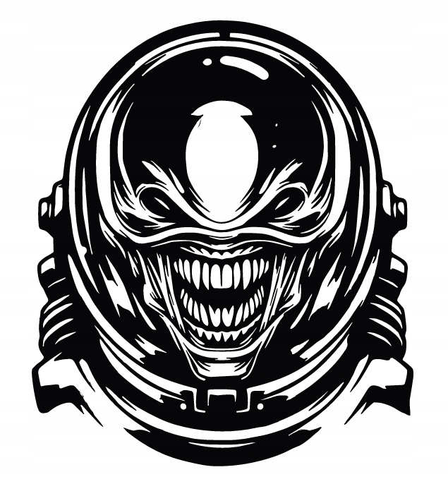 Dekoracja przedstawia niepokojącą postać w hełmie astronauty, w której wnętrzu kryje się złowieszcze oblicze o szerokim, nienaturalnym uśmiechu. Połączenie motywów kosmicznych z grozą tworzy niezwykle dynamiczny i mroczny efekt wizualny. Mocne kontrasty i ostre linie nadają pracy energię oraz dramatyzm, sprawiając, że przyciąga wzrok i budzi emocje.