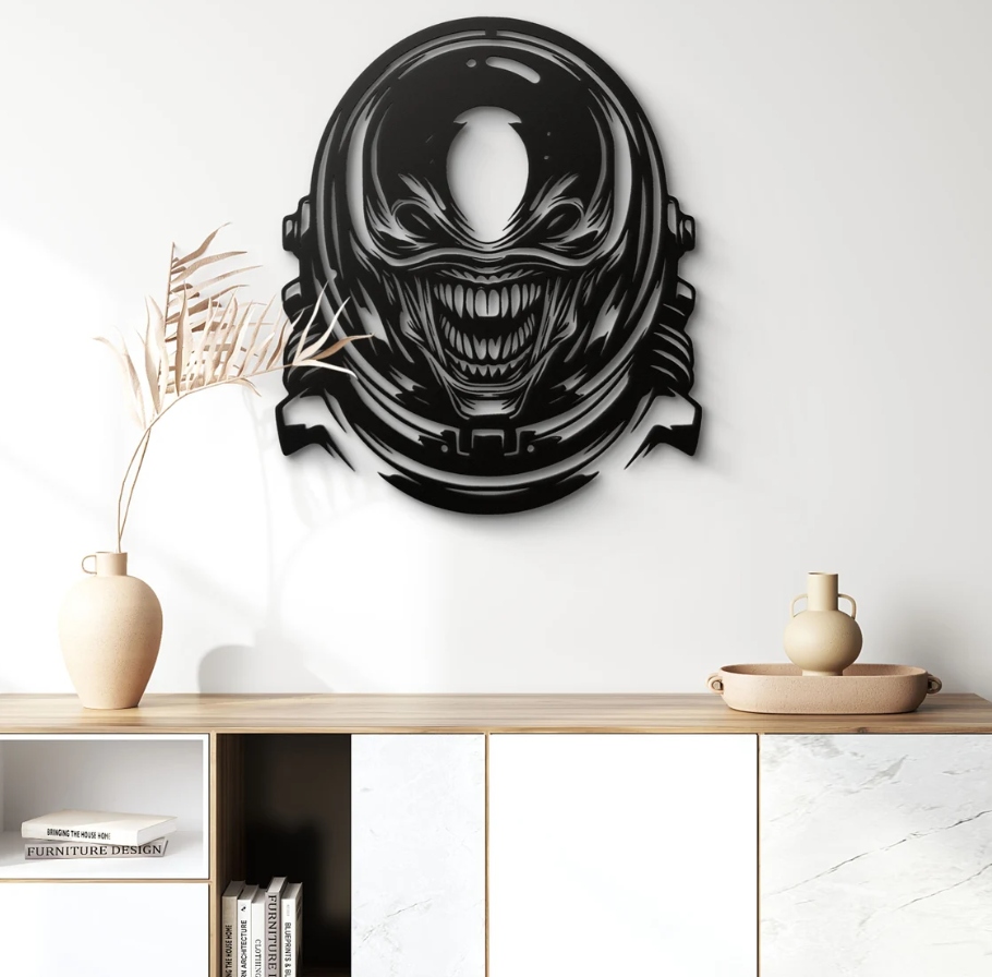 Dekoracja przedstawia niepokojącą postać w hełmie astronauty, w której wnętrzu kryje się złowieszcze oblicze o szerokim, nienaturalnym uśmiechu. Połączenie motywów kosmicznych z grozą tworzy niezwykle dynamiczny i mroczny efekt wizualny. Mocne kontrasty i ostre linie nadają pracy energię oraz dramatyzm, sprawiając, że przyciąga wzrok i budzi emocje.