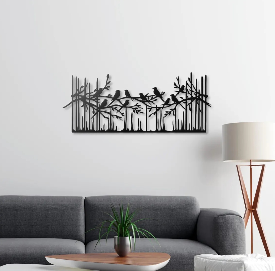 Ta dekoracja ścienna przedstawia delikatną kompozycję gałązek z siedzącymi na nich ptakami, tworząc subtelny, naturalny motyw. Smukłe linie gałęzi i pionowe tło przypominające trawy lub trzcinę nadają całości lekkość i przestrzenność.