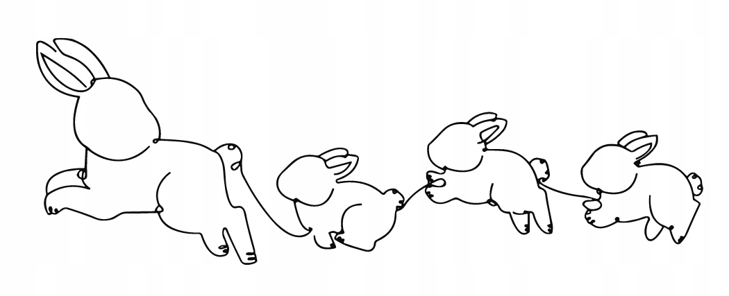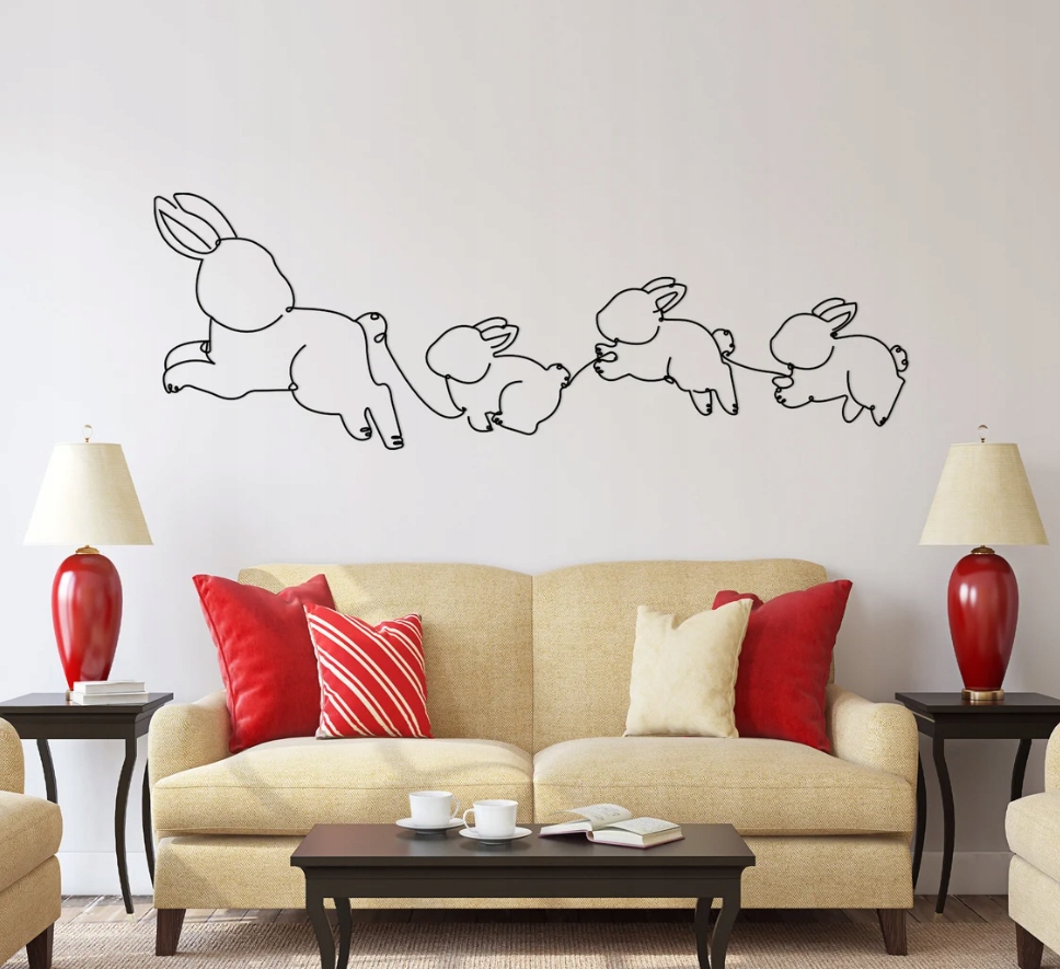 Ta dekoracja ukazuje zająca prowadzącego trzy małe króliczki, wykonane w lekkim, jednoprzebiegowym stylu linii. Motyw rodziny królików kojarzy się z ciepłem domowego ogniska, bezpieczeństwem i radością.