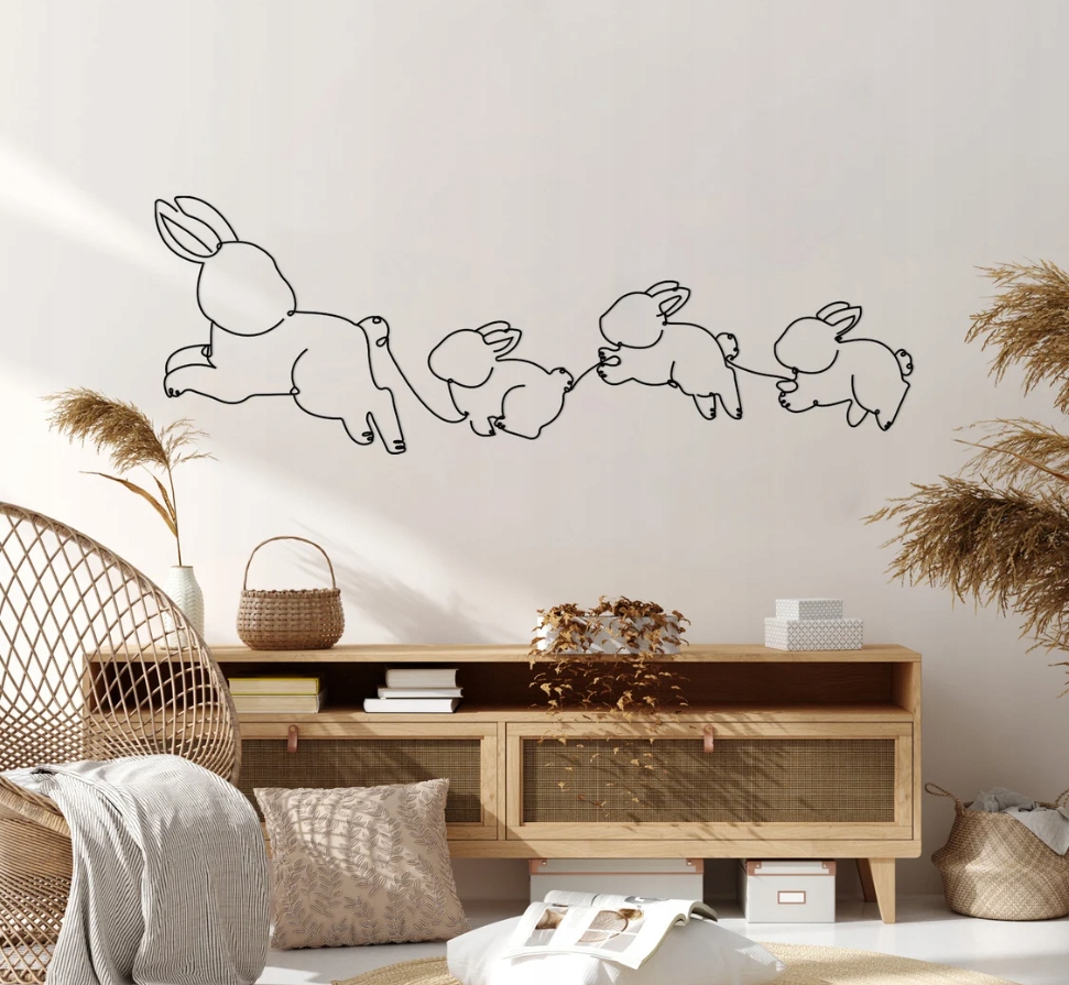 Ta dekoracja ukazuje zająca prowadzącego trzy małe króliczki, wykonane w lekkim, jednoprzebiegowym stylu linii. Motyw rodziny królików kojarzy się z ciepłem domowego ogniska, bezpieczeństwem i radością.