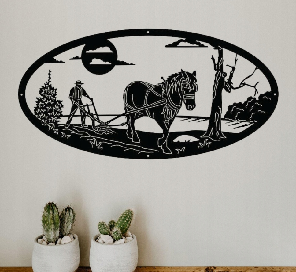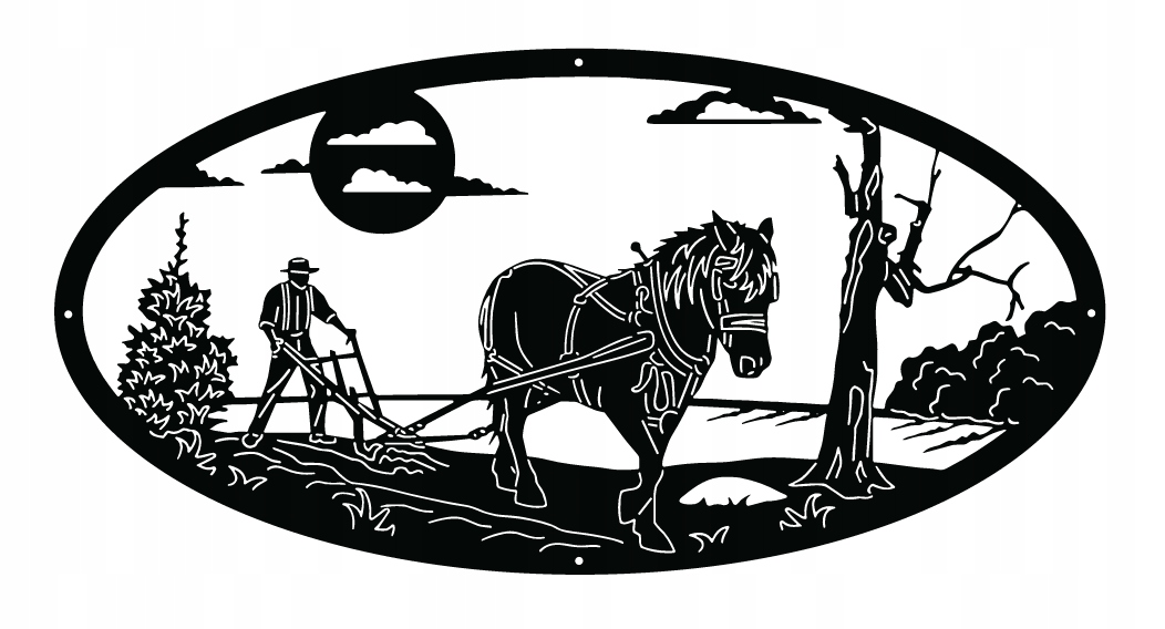 Na obrazku widzimy scenę wiejską przedstawioną w czarno-białym stylu graficznym. W centrum znajduje się koń zaprzężony do pługa, który prowadzony jest przez rolnika. Mężczyzna idzie tuż za zwierzęciem, kierując narzędziem służącym do orania ziemi.