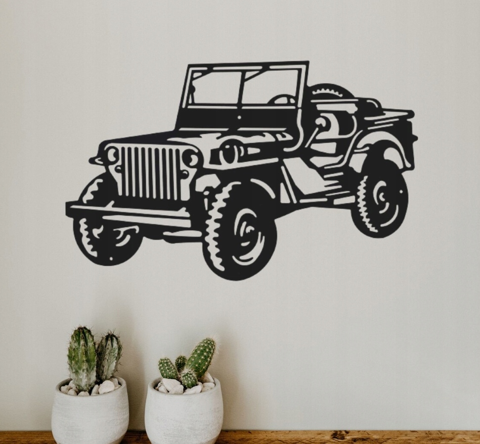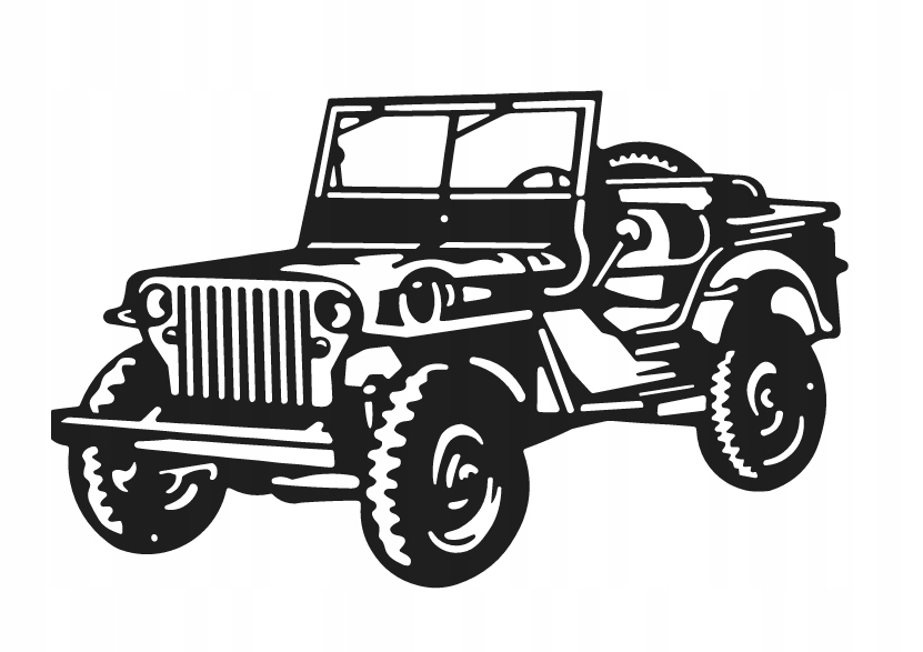 Na ilustracji widzimy klasyczny wojskowy jeep terenowy w stylu retro. Pojazd ma charakterystyczną sylwetkę – otwarta kabina z prostą szybą, koło zapasowe umieszczone z tyłu oraz wyraźnie zaznaczone, masywne opony przystosowane do trudnego terenu.