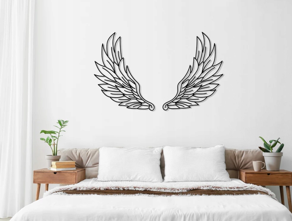 Motyw skrzydeł doskonale sprawdzi się jako ozdoba wnętrza w stylu nowoczesnym lub minimalistycznym, dodając mu harmonii i przestronności. Może pełnić funkcję delikatnego akcentu symbolicznego, wprowadzając atmosferę spokoju i równowagi. W prostocie tej kompozycji kryje się lekkość i uniwersalność, które czynią ją ponadczasową dekoracją.