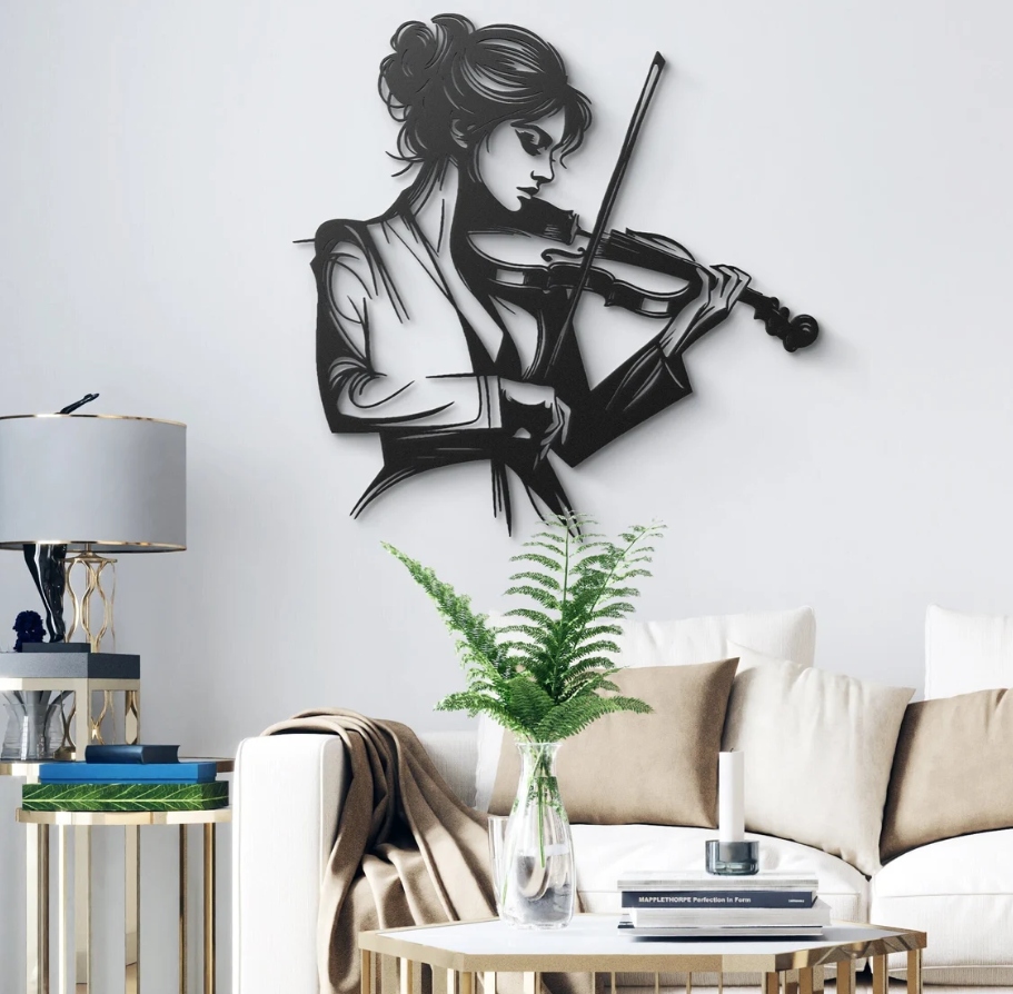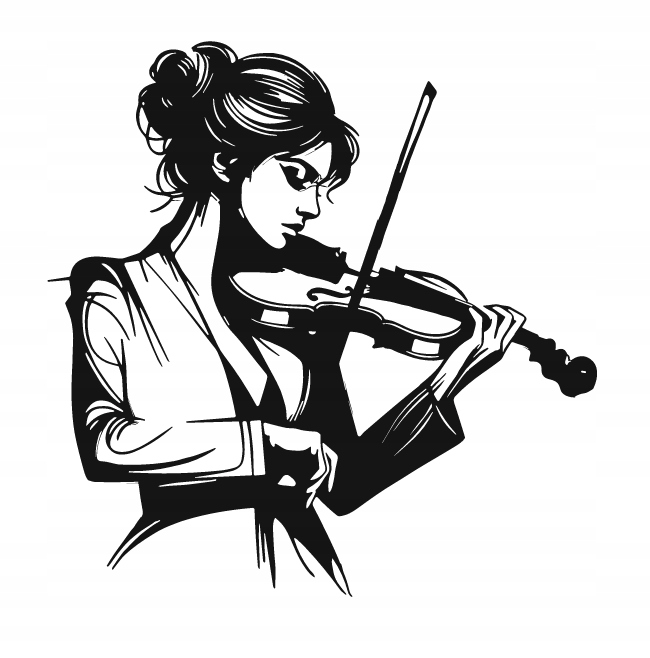 Dekoracja ukazuje kobietę grającą na skrzypcach, utrzymaną w dynamicznej, kontrastowej formie czerni i bieli. Subtelne linie i wyraziste cieniowanie tworzą wrażenie ruchu, a zarazem skupienia i elegancji. Postać z zamkniętymi oczami emanuje spokojem oraz emocjonalnym zaangażowaniem, oddając moment pełnego zanurzenia w muzyce.