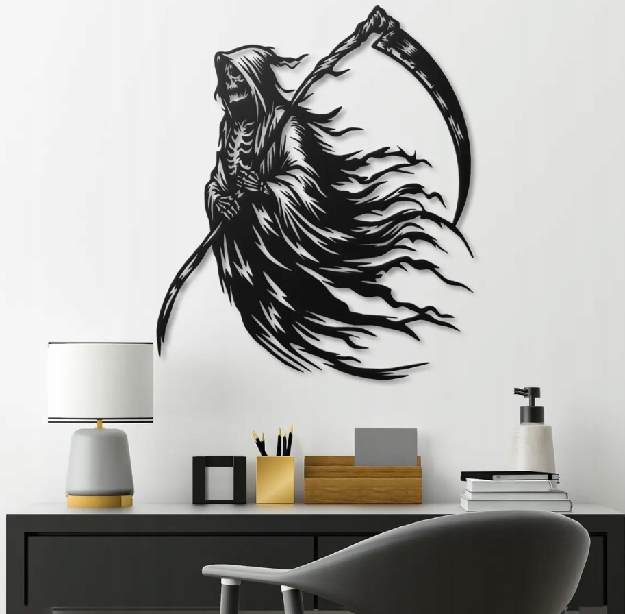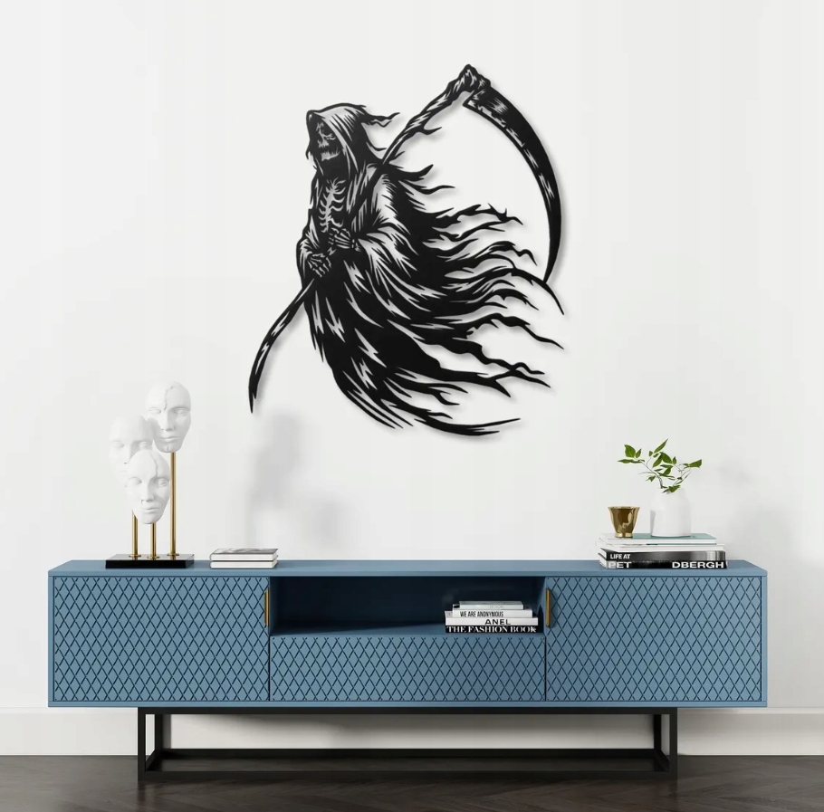Tego typu wzór to mocny akcent symboliczny – uosobienie przemijania, tajemnicy i potęgi nieuchronnego losu. W aranżacji wnętrza dekoracja wprowadza element mrocznej elegancji i refleksji nad cyklem życia. Doskonale sprawdzi się jako ozdoba w stylu gotyckim, rockowym lub industrialnym, np. na ścianie salonu, w pracowni artystycznej albo w garażu jako wyrazisty, nieco buntowniczy motyw.