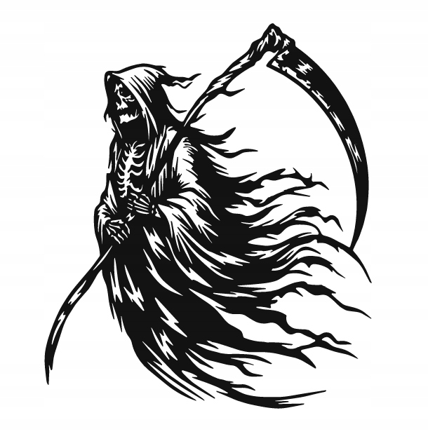 Ta dekoracja przedstawia klasyczny motyw ponurego żniwiarza – postać w rozwianej szacie, trzymającą kosę o ostrzu zakrzywionym niczym półksiężyc. Dynamiczne linie i efekty przypominające płomienie nadają całości wrażenie ruchu, jakby postać unosiła się w powietrzu lub wychodziła z cienia.
