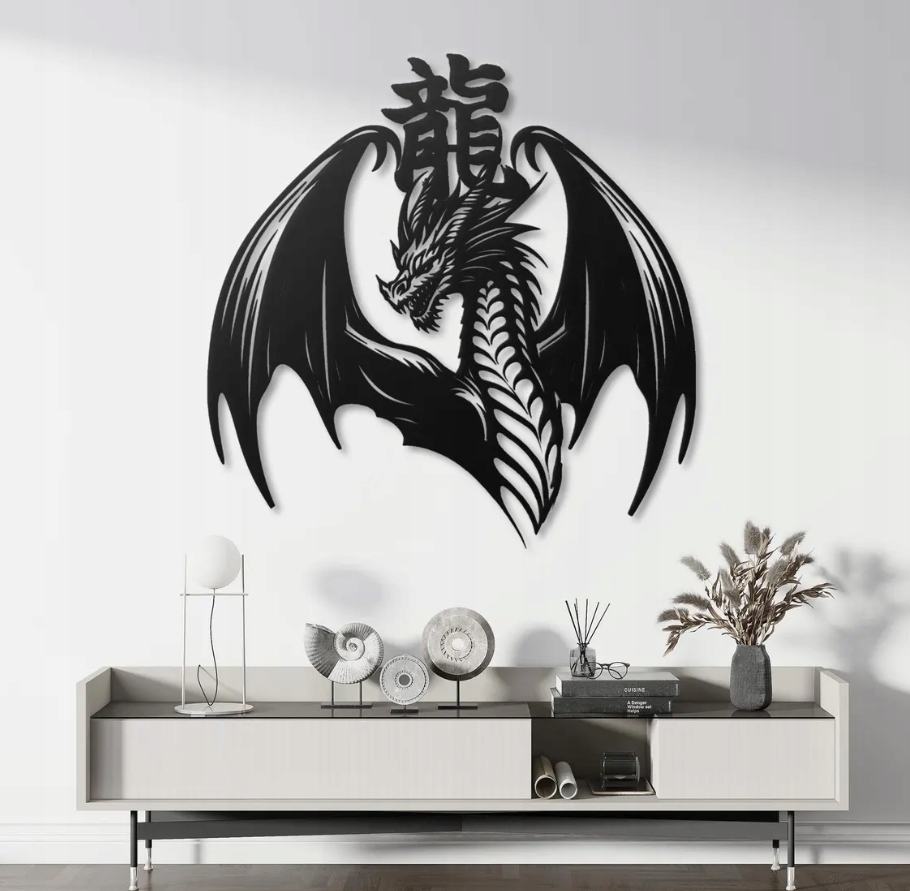 Ta dekoracja przedstawia potężnego, skrzydlatego smoka z chińskim symbolem umieszczonym nad jego głową. Motyw smoka od wieków symbolizuje siłę, mądrość, ochronę i duchową potęgę — w kulturze Wschodu jest strażnikiem równowagi i symbolem szczęścia. Dynamiczna kompozycja skrzydeł i wyrazista forma nadają wzorowi wyjątkowego charakteru, łącząc mistyczny majestat z energią ruchu.