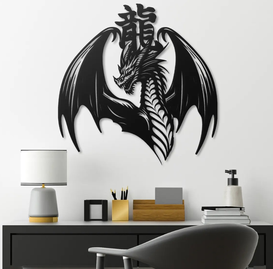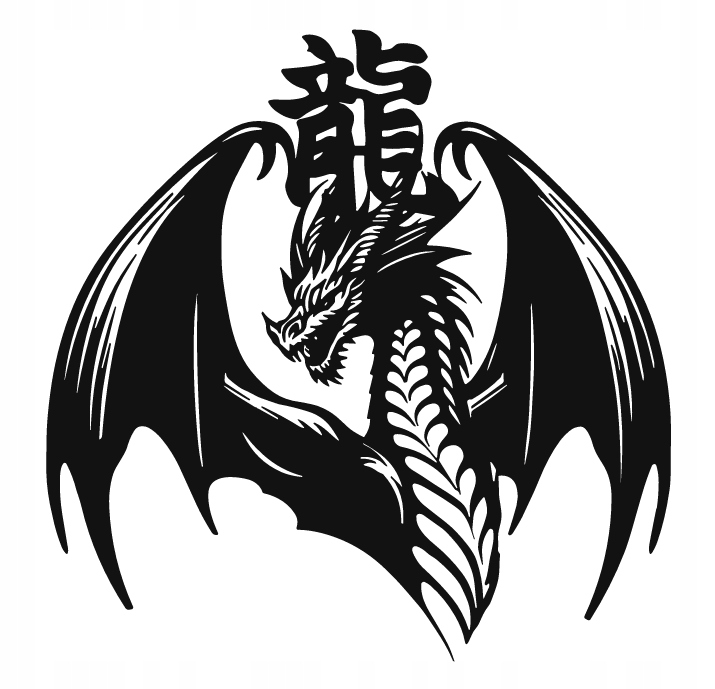 Ta dekoracja przedstawia potężnego, skrzydlatego smoka z chińskim symbolem umieszczonym nad jego głową. Motyw smoka od wieków symbolizuje siłę, mądrość, ochronę i duchową potęgę — w kulturze Wschodu jest strażnikiem równowagi i symbolem szczęścia. Dynamiczna kompozycja skrzydeł i wyrazista forma nadają wzorowi wyjątkowego charakteru, łącząc mistyczny majestat z energią ruchu.