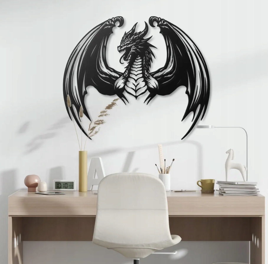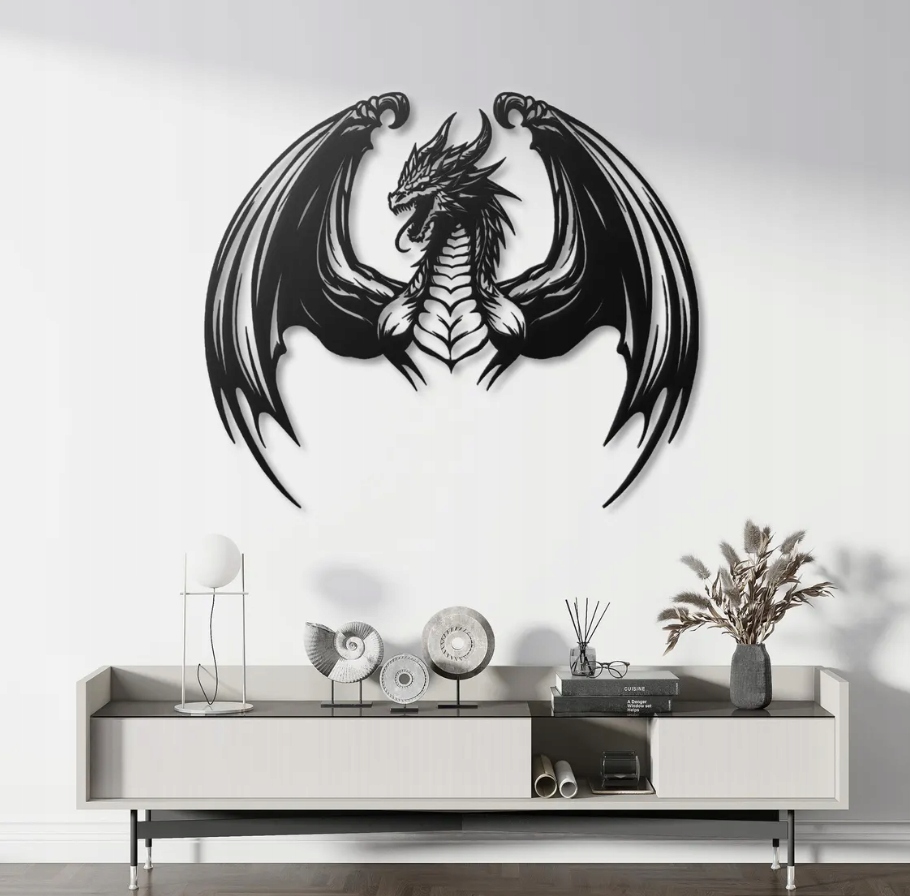 Motyw smoka symbolizuje moc, odwagę i niezłomność. To dekoracja idealna dla osób ceniących fantastyczne, mityczne motywy i ekspresyjne formy artystyczne. Doskonale sprawdzi się w nowoczesnych wnętrzach, nadając im wyjątkowego charakteru i tajemniczej atmosfery. Smok staje się tu strażnikiem przestrzeni – symbolem siły ducha i wewnętrznej energii.