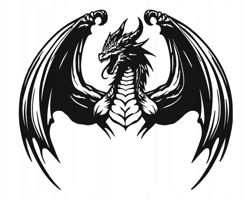 Dekoracja przedstawia potężnego smoka z rozpostartymi skrzydłami, wykonanego w dynamicznym, graficznym stylu. Precyzyjne linie podkreślają jego muskularne ciało, ostre łuski i majestatyczną postawę, tworząc obraz pełen energii i siły. Rozłożyste skrzydła nadają kompozycji symetrię i monumentalny charakter, a ostre kontury wzmacniają wrażenie potęgi i dominacji.