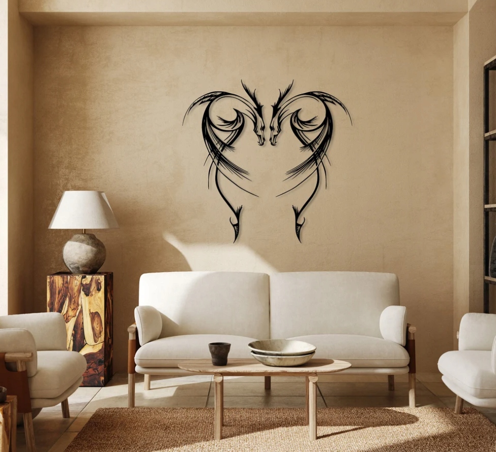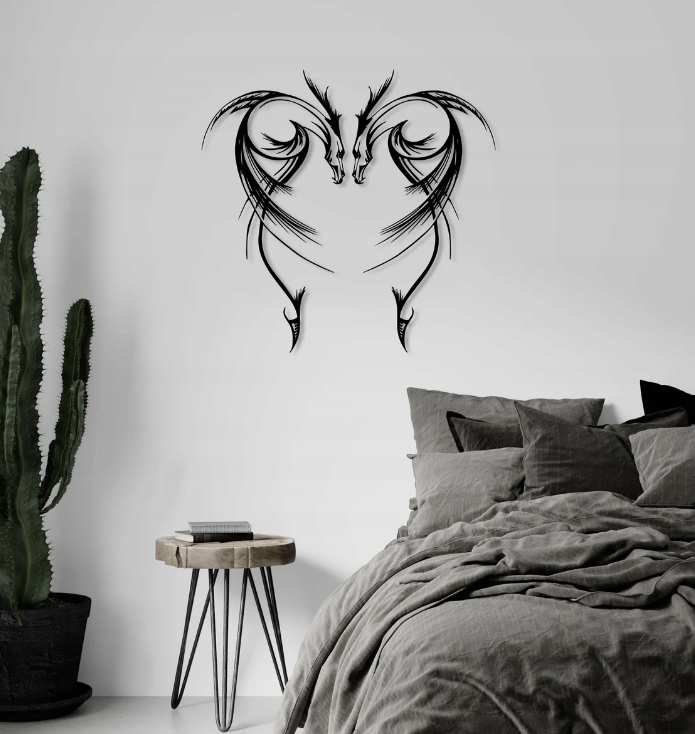 Ta dekoracja przedstawia dwa symetrycznie ułożone, stylizowane konie, które tworzą razem formę przypominającą serce. Smukłe, dynamiczne linie nadają całości wrażenie ruchu i energii, a zarazem elegancji. Cienkie i grubsze kreski przenikają się ze sobą, co podkreśla lekkość i płynność kompozycji.Motyw ten doskonale sprawdzi się jako dekoracja o charakterze symbolicznym – może wyrażać siłę, wolność i harmonię. Ze względu na swoją symetryczną formę oraz artystyczny charakter, idealnie pasuje do wnętrz nowoczesnych lub w stylu industrialnym, wprowadzając subtelny, lecz wyrazisty akcent.