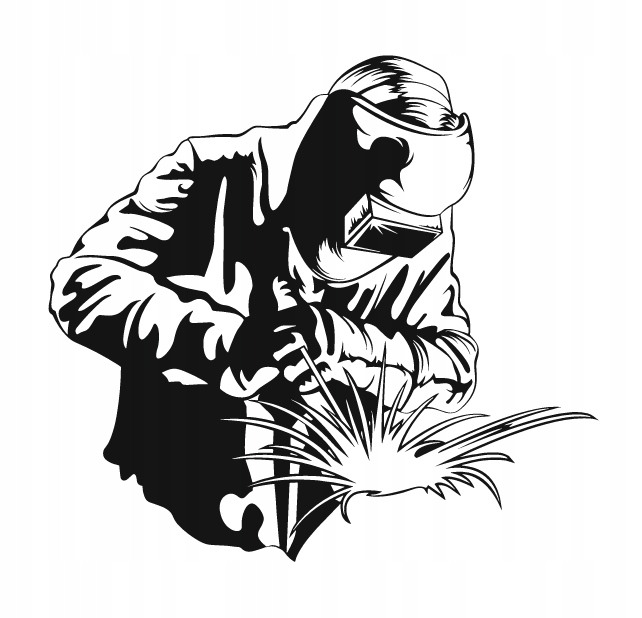 Na ilustracji widzimy postać spawacza w masce ochronnej, pochyloną nad pracą. Widać wyraźne rozbłyski i iskry, które symbolizują intensywny proces spawania. Postać ubrana jest w ochronny strój, który podkreśla trudny i wymagający charakter tego zawodu.