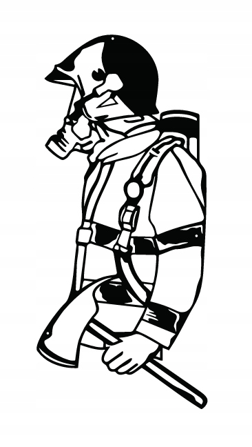 Na ilustracji widoczny jest strażak przedstawiony w stroju ochronnym. Ubrany jest w specjalny kombinezon z pasami, a na głowie ma hełm oraz maskę tlenową, które chronią go przed działaniem dymu i ognia. Na plecach znajduje się butla z powietrzem, umożliwiająca oddychanie w trudnych warunkach. W dłoni trzyma topór strażacki, będący jednym z podstawowych narzędzi w akcjach ratunkowych.