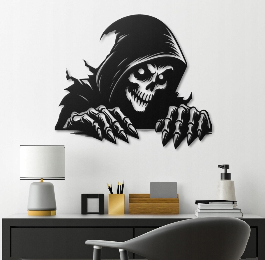 Dekoracja przedstawia postać szkieletu w kapturze, wyłaniającego się z cienia z szerokim, złowieszczym uśmiechem. Mocne kontrasty i ostre linie podkreślają groźny wyraz twarzy oraz dynamiczny charakter kompozycji, nadając jej mroczny i efektowny wygląd.