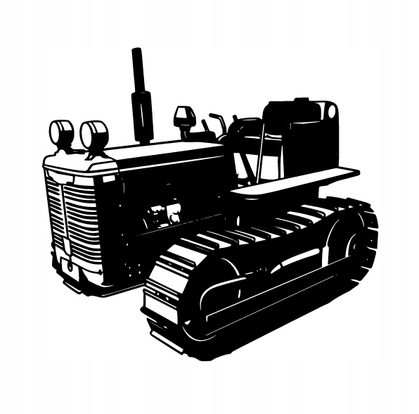 Na obrazku widzimy gąsienicowy traktor w stylu retro, przedstawiony w czarno-białej grafice. Maszyna wyróżnia się solidną budową, charakterystycznymi reflektorami z przodu oraz wyraźnie zaznaczonymi gąsienicami, które nadają jej potężny i stabilny wygląd.