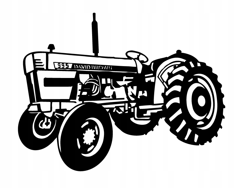 Na obrazku widzimy ciągnik rolniczy przedstawiony w czarno-białej grafice. Pojazd ma duże, wyraźnie zarysowane tylne koło, które jest przystosowane do pracy w trudnych warunkach polowych, oraz mniejsze przednie koła nadające mu zwrotność. Nadwozie ciągnika jest masywne, a na masce widoczny jest napis „David Brown 995”, wskazujący na konkretny model.