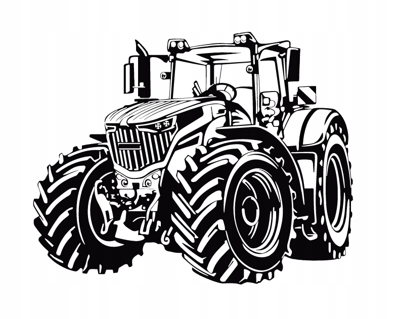 Na ilustracji widoczny jest nowoczesny traktor przedstawiony w stylu czarno-białej grafiki. Maszyna ma masywną sylwetkę, duże opony z wyraźnym bieżnikiem oraz bogate detale kabiny i maski silnika, które nadają jej dynamiczny charakter.