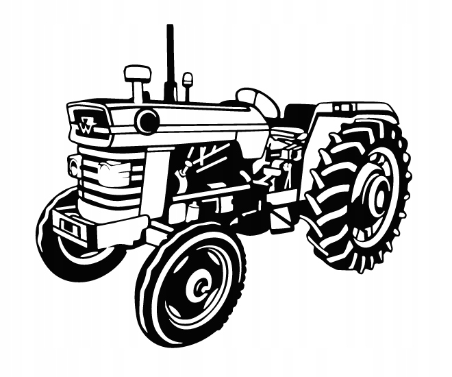 Na ilustracji znajduje się traktor przedstawiony w charakterystycznym, graficznym stylu. Pojazd ma masywną konstrukcję, duże tylne koła z wyraźnym bieżnikiem oraz mniejsze przednie koła, które zapewniają mu stabilność podczas pracy w polu. Widoczne są także szczegóły takie jak reflektory, kierownica i elementy mechaniczne, które podkreślają jego techniczny charakter.