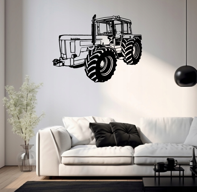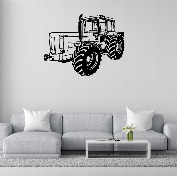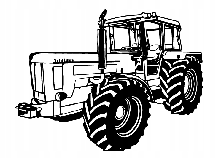 Kabina traktora jest zabudowana i przestronna, z widocznymi szybami oraz kierownicą w środku. Całość utrzymana jest w mocnym czarno-białym kontraście, co nadaje rysunkowi wyrazistości. Grafika podkreśla solidność, siłę i praktyczne zastosowanie pojazdu w pracy polowej.