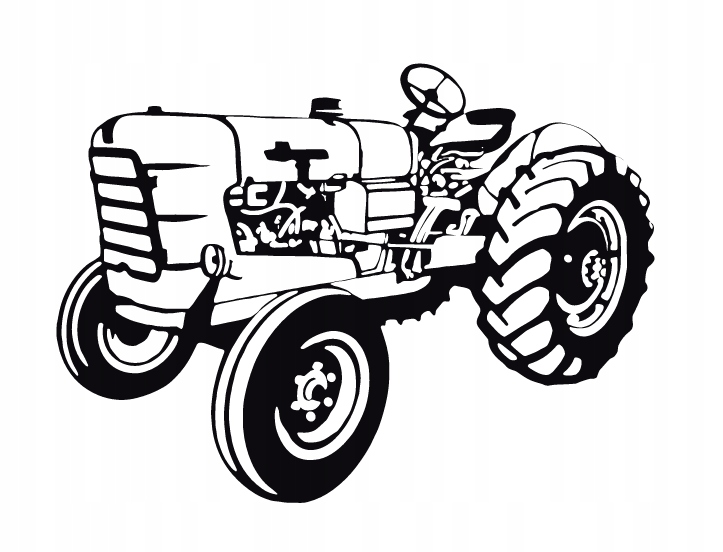 Na obrazku znajduje się klasyczny traktor, narysowany w czerni i bieli w stylu przypominającym grafikę wektorową. Jego masywne tylne koło i mniejsze przednie są dobrze zaakcentowane, co podkreśla stabilność i siłę maszyny. Konstrukcja wygląda na starszy model, co nadaje jej charakteru i przywołuje skojarzenia z tradycyjnym rolnictwem.