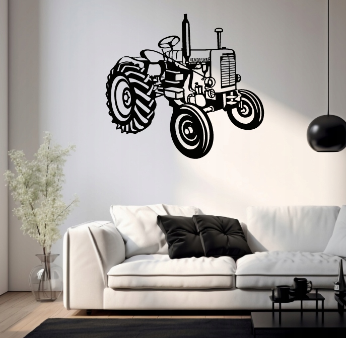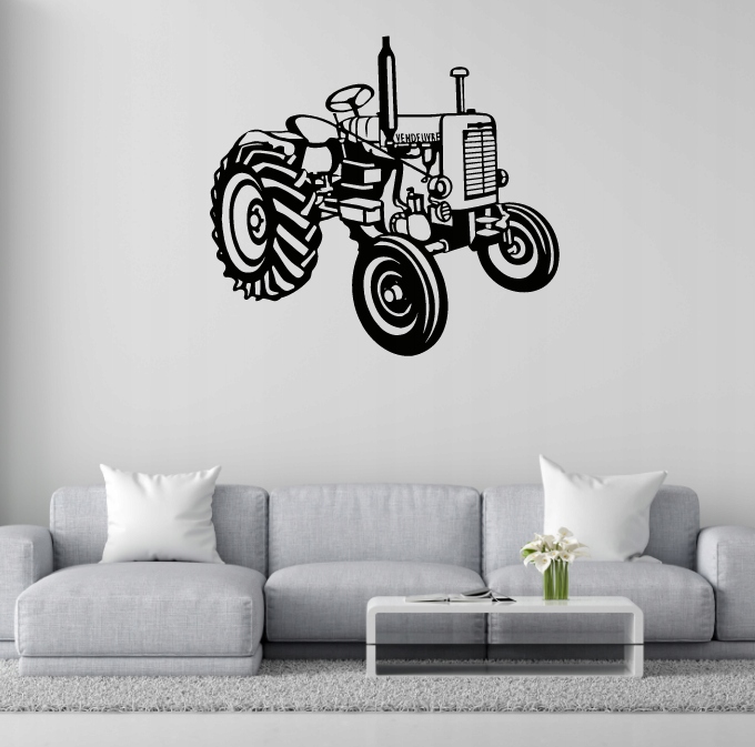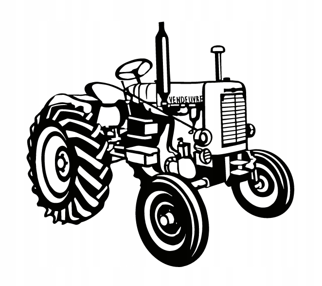 Na grafice widoczny jest klasyczny traktor, ukazany w perspektywie z lekkiego skosu. Pojazd ma duże tylne koła z wyraźnym bieżnikiem oraz mniejsze przednie, co podkreśla jego funkcjonalny charakter. Linie rysunku są mocne i kontrastowe, co dodaje całości wyrazistości.