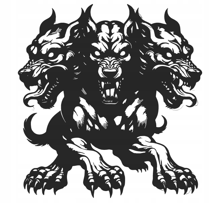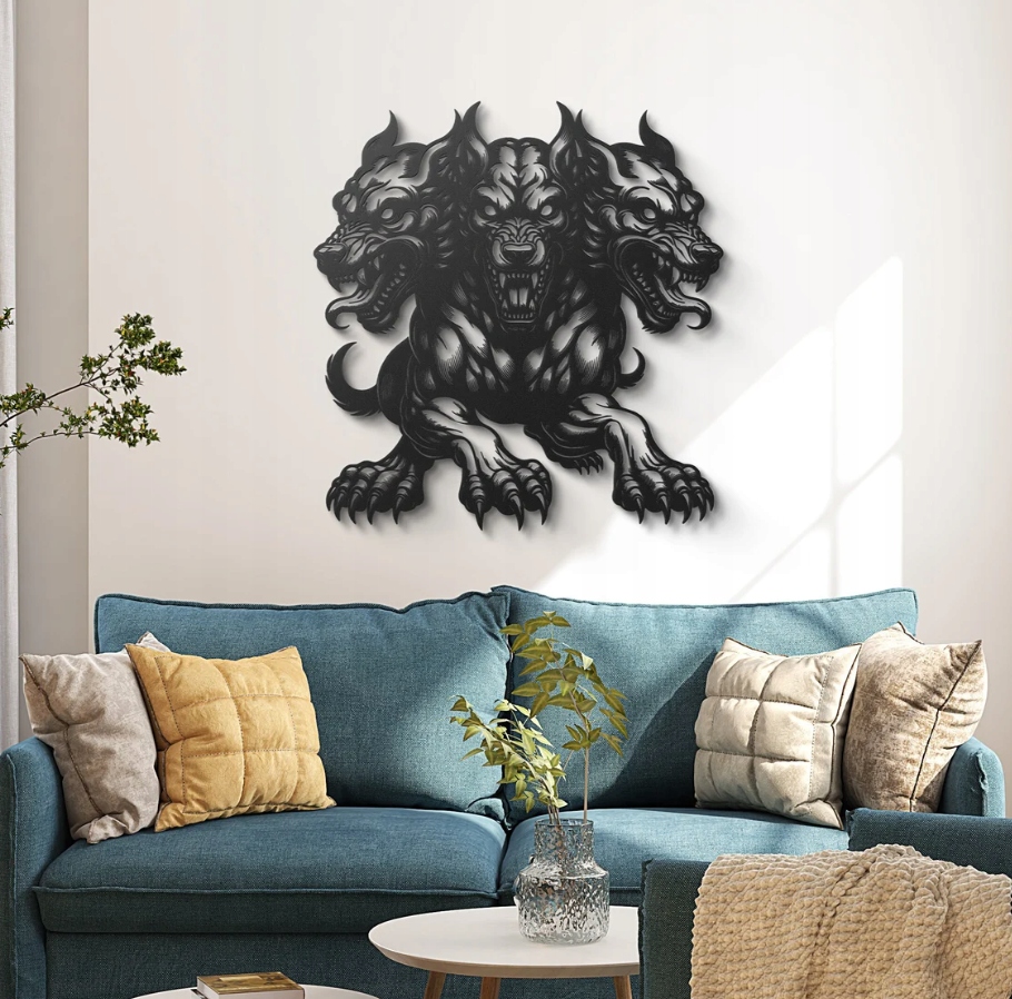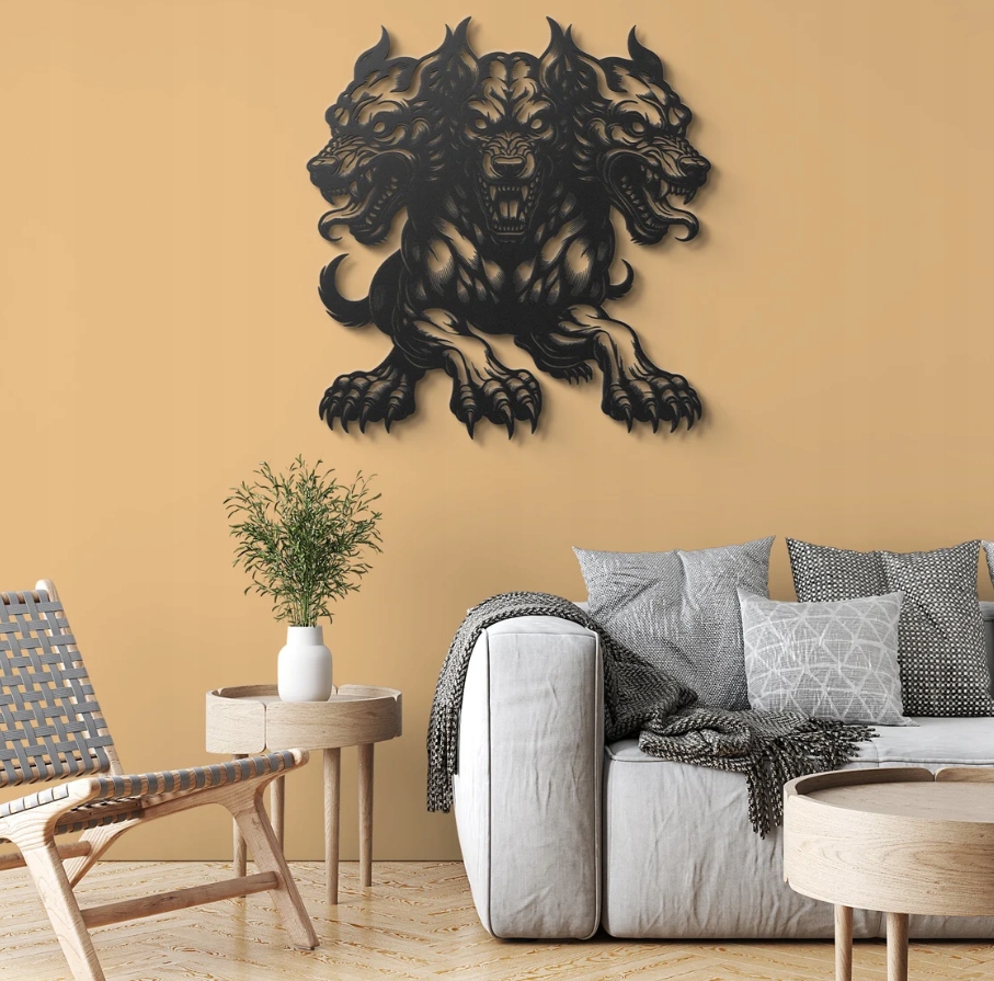 Ta dekoracja przedstawia potężnego, trzygłowego psa – mitycznego strażnika, który symbolizuje siłę, czujność i odwagę. Dynamiczne linie oraz wyraziste kontrasty czerni i bieli nadają mu intensywnego, niemal trójwymiarowego charakteru.