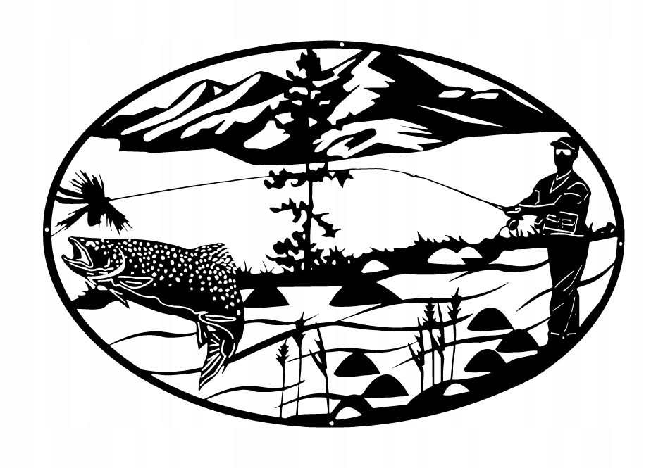 Obraz przedstawia scenę wędkarską zamkniętą w owalnej ramie. Po prawej stronie stoi mężczyzna zajęty łowieniem ryb – trzyma wędkę, a jego sylwetka sugeruje skupienie i doświadczenie. Na końcu żyłki widzimy dużą rybę, która właśnie wyskakuje ponad taflę wody, tworząc wrażenie dynamicznego momentu złowienia.
