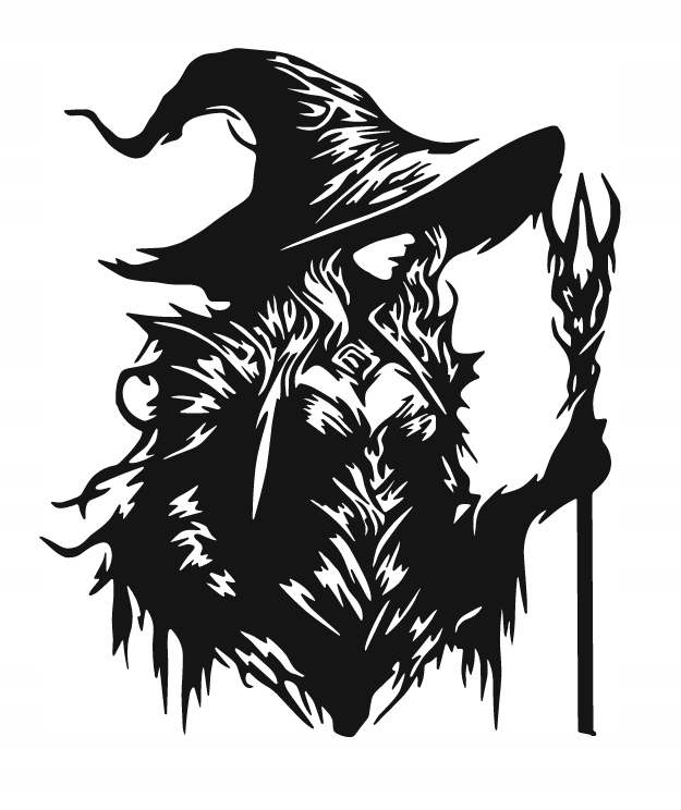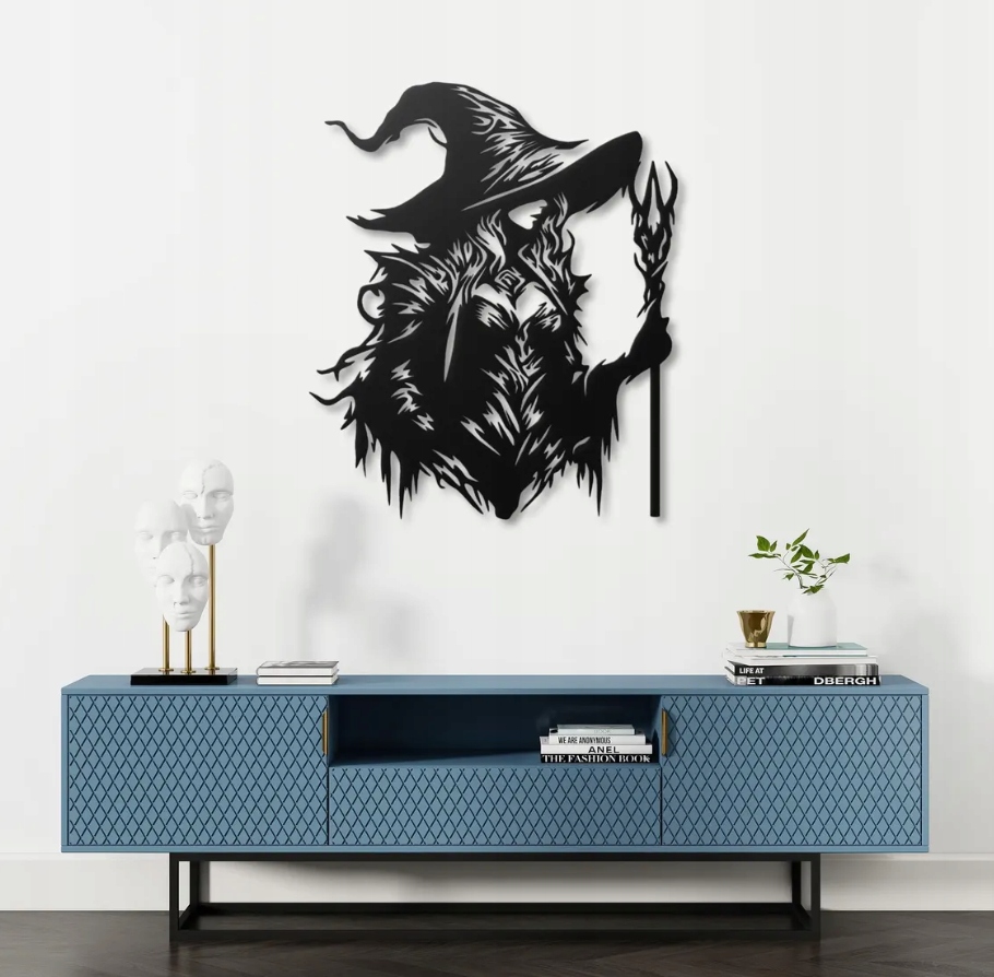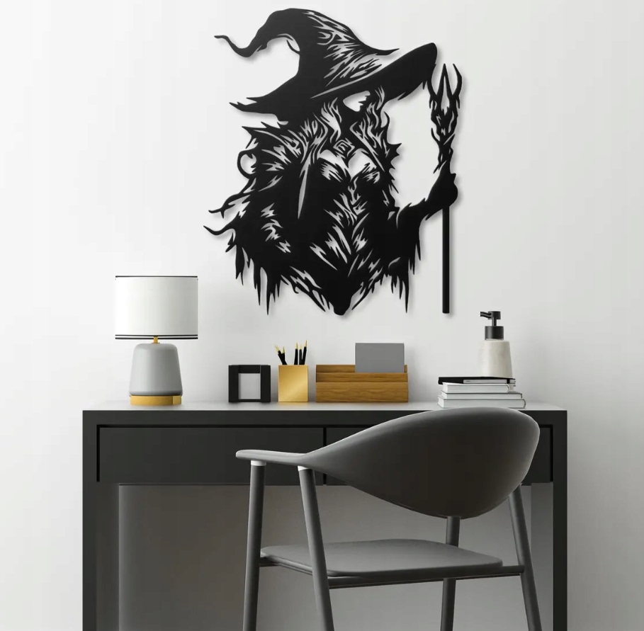 Ta dekoracja ścienna przedstawia tajemniczą postać czarodziejki w spiczastym kapeluszu, trzymającej magiczne berło. Jej sylwetka zbudowana z dynamicznych, ostrych linii nadaje kompozycji mroczny, fantastyczny charakter, przywodząc na myśl świat magii i czarów. Czerń i biel tworzą silny kontrast, który sprawia, że wzór wygląda niezwykle efektownie i przyciąga uwagę.