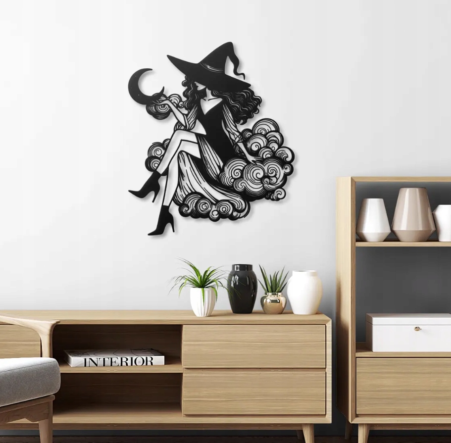 Motyw symbolizuje magię, kobiecą siłę i niezależność, a także fascynację światem fantazji. To dekoracja, która wniesie do wnętrza nutę tajemnicy i oryginalności, doskonale sprawdzając się w aranżacjach inspirowanych sztuką nowoczesną i klimatem baśniowym.