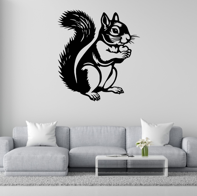 Na obrazku widzimy wiewiórkę w charakterystycznej pozie – siedzi na tylnych łapkach, a w przednich trzyma orzech. Jej oczy są szeroko otwarte, co nadaje jej wyraz czujności i zainteresowania. Szczególną uwagę przyciąga duży, puszysty ogon, wygięty do góry i bogato podkreślony kontrastującymi liniami.