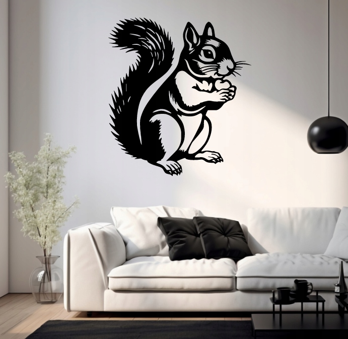 Grafika jest czarno-biała, wykonana w stylu przypominającym drzeworyt lub linoryt, z mocnymi konturami i wyraźnym światłocieniem. Całość oddaje zarówno urok, jak i spryt tego niewielkiego zwierzęcia, które od razu kojarzy się z lasem, przyrodą i gromadzeniem zapasów na zimę.
