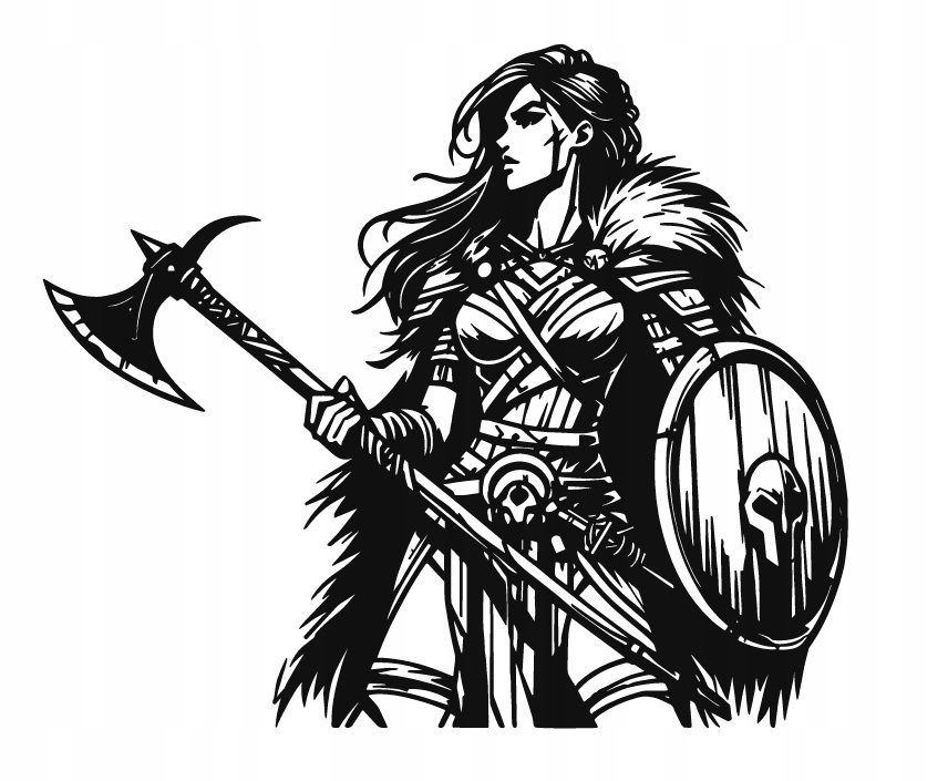 Dekoracja przedstawia wojowniczkę w pełnym rynsztunku, trzymającą w dłoniach topór bojowy i tarczę. Mocne kontrastowe linie podkreślają siłę jej sylwetki, a detale stroju – futrzany płaszcz, zbroja i broń – nadają całości dynamiczny, pełen mocy charakter.