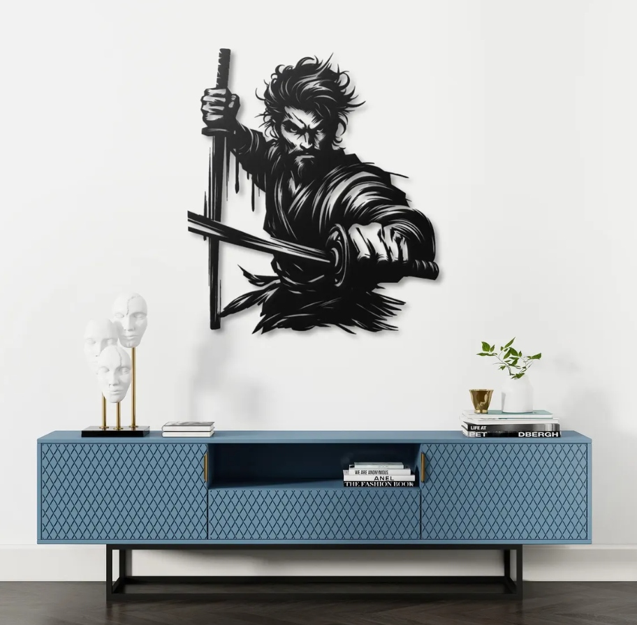 Ta dekoracja ścienna przedstawia wojownika w dynamicznej pozie z mieczem, co symbolizuje siłę, determinację i odwagę. Mocne kontrasty czerni i bieli podkreślają napięcie ruchu oraz skupienie postaci, tworząc wyjątkowo energetyczny i dramatyczny efekt wizualny. Kompozycja pełna ekspresji sprawia, że dekoracja staje się centralnym punktem wnętrza, przyciągając wzrok i nadając przestrzeni charakteru.