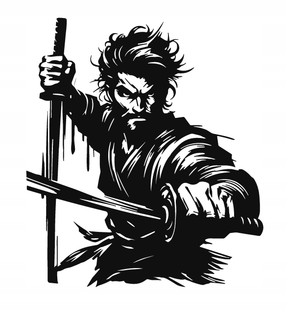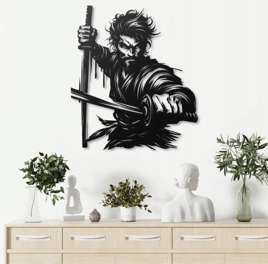 Ta dekoracja ścienna przedstawia wojownika w dynamicznej pozie z mieczem, co symbolizuje siłę, determinację i odwagę. Mocne kontrasty czerni i bieli podkreślają napięcie ruchu oraz skupienie postaci, tworząc wyjątkowo energetyczny i dramatyczny efekt wizualny. Kompozycja pełna ekspresji sprawia, że dekoracja staje się centralnym punktem wnętrza, przyciągając wzrok i nadając przestrzeni charakteru.