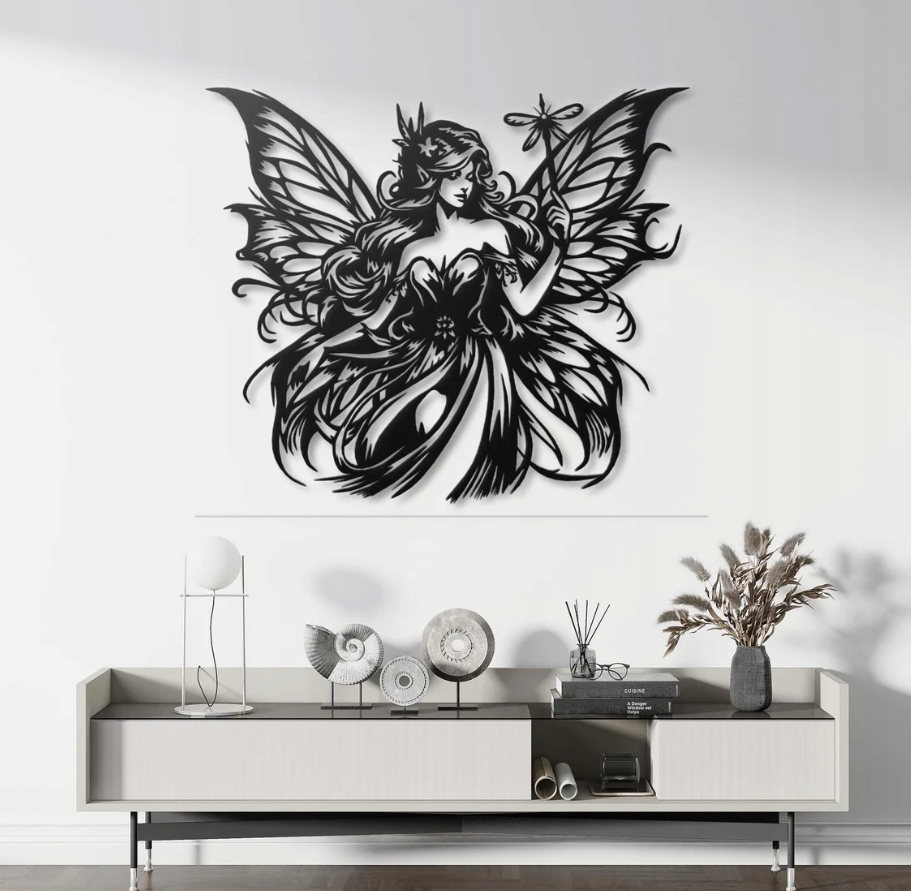 Dekoracja przedstawia eteryczną wróżkę z rozłożystymi, misternie zdobionymi skrzydłami i długimi, falującymi włosami. W dłoni trzyma delikatną ważkę niczym magiczną różdżkę, a cała kompozycja emanuje lekkością i baśniowym urokiem. Finezyjne linie i bogactwo detali tworzą wrażenie ruchu, jakby postać właśnie zstępowała z leśnej polany wprost w świat wyobraźni.