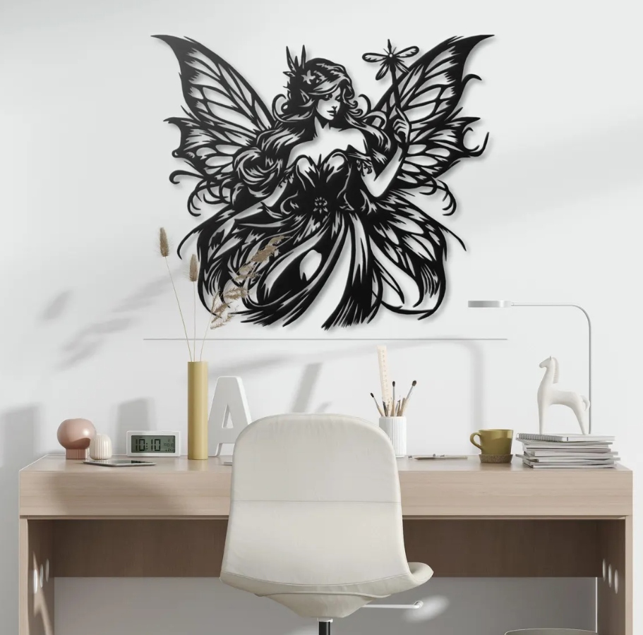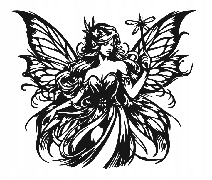 Dekoracja przedstawia eteryczną wróżkę z rozłożystymi, misternie zdobionymi skrzydłami i długimi, falującymi włosami. W dłoni trzyma delikatną ważkę niczym magiczną różdżkę, a cała kompozycja emanuje lekkością i baśniowym urokiem. Finezyjne linie i bogactwo detali tworzą wrażenie ruchu, jakby postać właśnie zstępowała z leśnej polany wprost w świat wyobraźni.