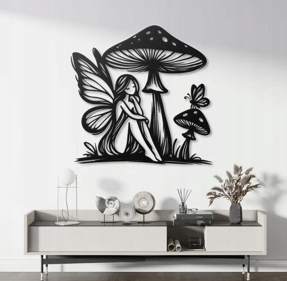 Dekoracja przedstawia uroczą wróżkę siedzącą pod dużym grzybem, otoczoną naturą i delikatnym motylem unoszącym się w powietrzu. Całość wykonana jest w lekkim, bajkowym stylu z wyraźnymi liniami i subtelnymi detalami, które nadają kompozycji wrażenie spokoju i harmonii. Postać wróżki, z delikatnymi skrzydłami i spokojną postawą, emanuje ciszą oraz magią leśnego świata.