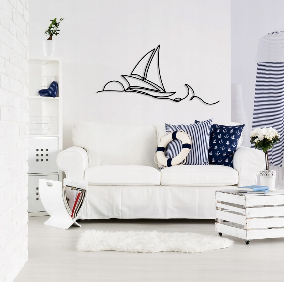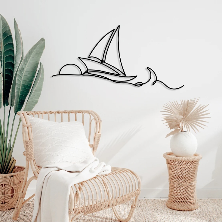 Dekoracja przedstawia żaglówkę na tle zachodzącego słońca, wykonaną w formie jednej, płynnej linii. Minimalistyczny styl nadaje jej lekkości i elegancji, a jednocześnie oddaje spokój i harmonię morskiego krajobrazu. Delikatne, falujące linie przywodzą na myśl ruch wody i wiatr w żaglach, tworząc wrażenie wolności i podróży.Taki motyw doskonale sprawdza się jako subtelna dekoracja wnętrza, wprowadzająca nastrój relaksu i przestrzeni. Symbolizuje spokój, marzenia i dążenie do celu, przez co może stanowić inspirujący akcent w pomieszczeniu — zarówno w domu, jak i w przestrzeni pracy.