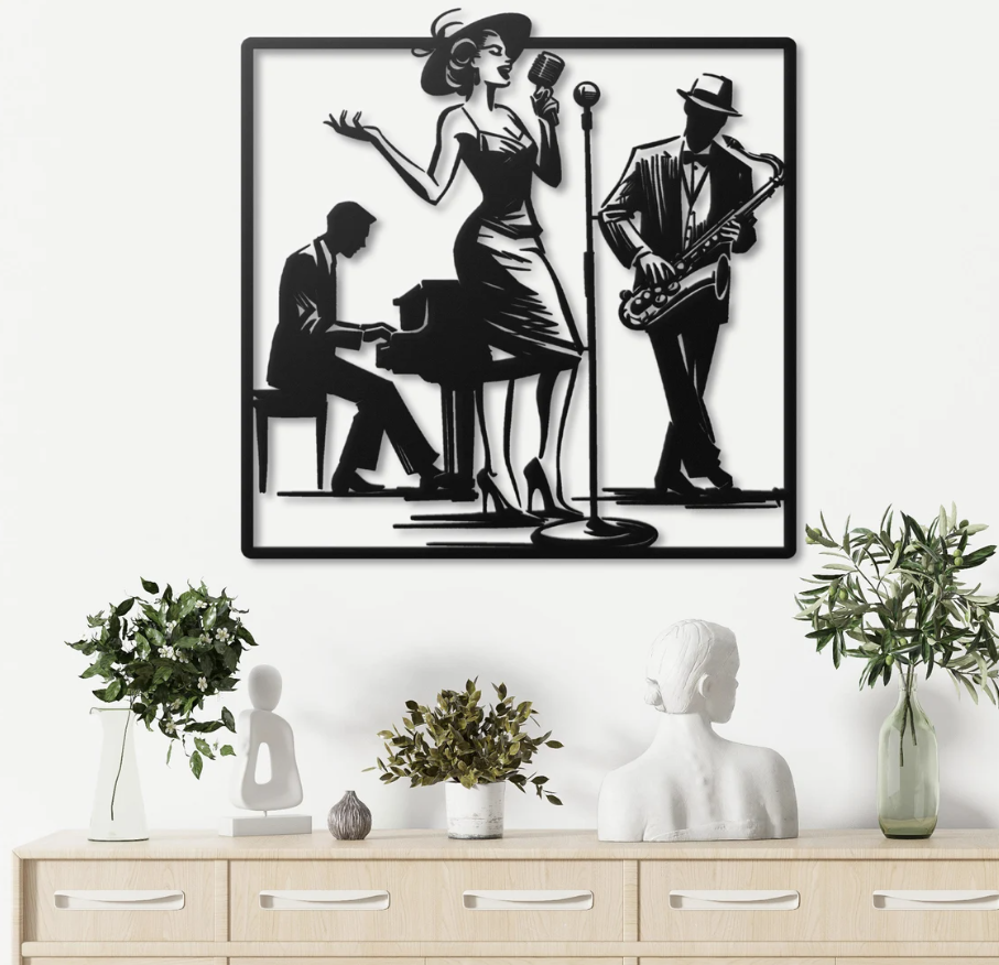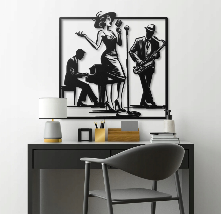 Dekoracja przedstawia scenę muzyczną z trójką artystów – wokalistką, saksofonistą i pianistą. Stylowe sylwetki, utrzymane w kontrastowym czarno-białym tonie, oddają klimat eleganckiego występu i dynamikę muzyki na żywo. Całość przyciąga uwagę harmonią formy i wyrazistością detali.Motyw symbolizuje pasję tworzenia, energię muzyki i artystyczny temperament. To dekoracja, która wnosi do wnętrza atmosferę jazzowego klubu i ponadczasowej elegancji, idealna dla miłośników muzyki, stylu retro oraz nowoczesnej sztuki z charakterem.Idealny na PREZENT