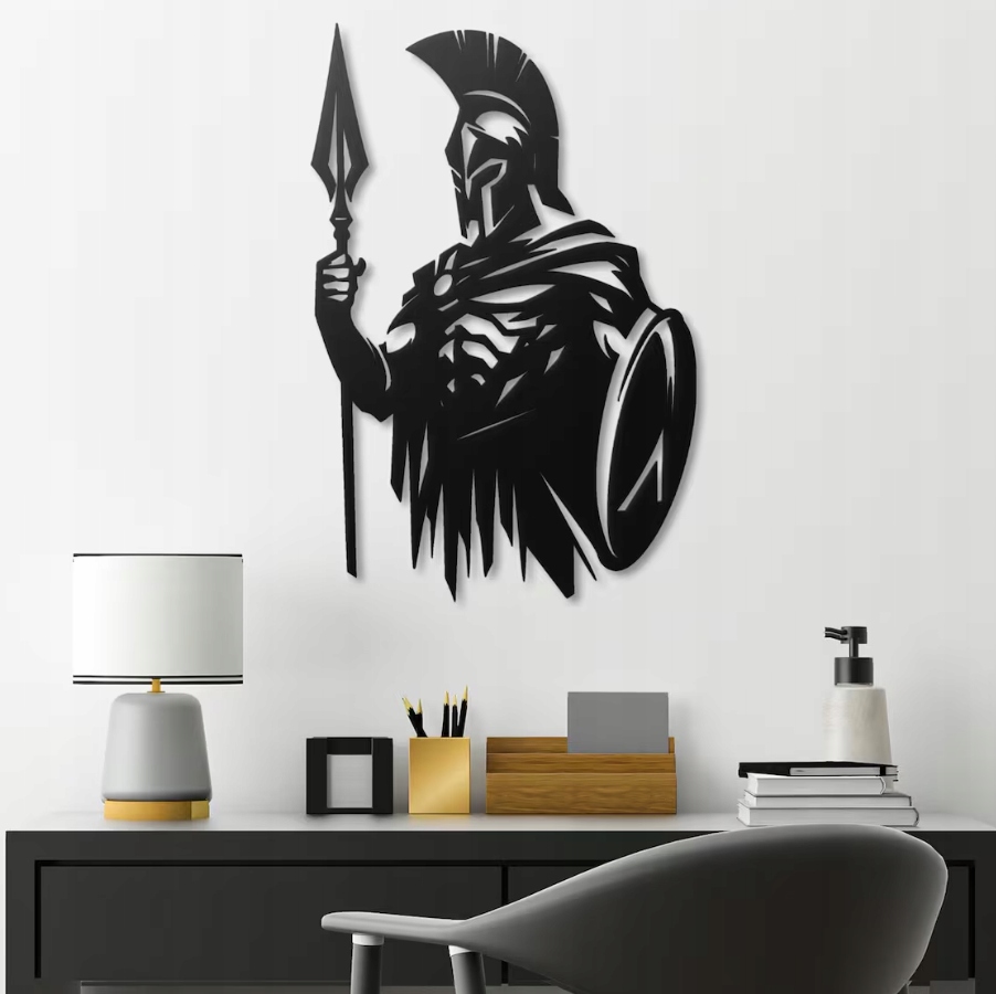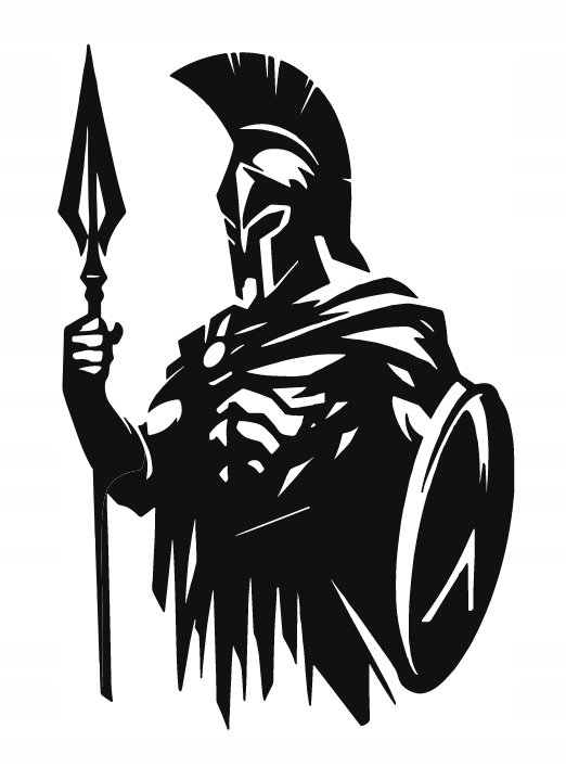 Dekoracja przedstawia potężnego wojownika w klasycznym, antycznym stylu. Postać odziana w zbroję, z charakterystycznym hełmem i pióropuszem, dzierży włócznię oraz tarczę, co nadaje jej majestatyczny i nieustraszony wygląd. Mocne kontrasty czerni i bieli podkreślają siłę, odwagę i determinację, jakie emanują z sylwetki. Linie są ostre i dynamiczne, co potęguje wrażenie ruchu i gotowości do walki.