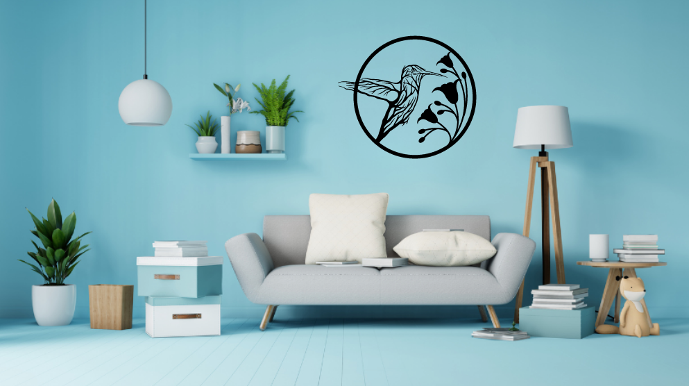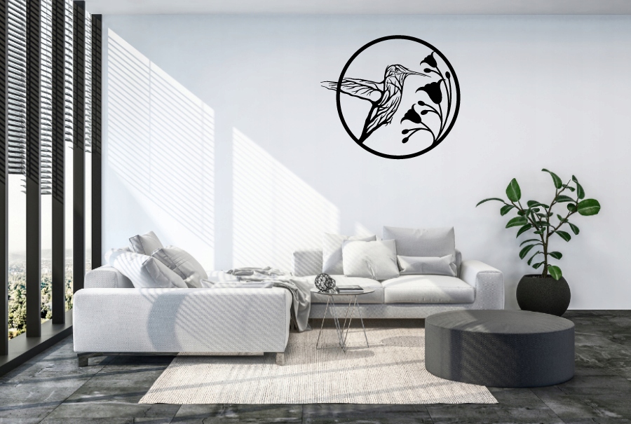 Dekoracja przedstawia wizerunek kolibra uchwyconego w locie, umieszczonego w okrągłej ramie. Ptak został ukazany w charakterystycznej pozie z wydłużonym dziobem skierowanym ku delikatnym, stylizowanym kwiatom, co tworzy harmonijną i naturalną scenę. Linie są subtelne, a jednocześnie dynamiczne, nadając kompozycji lekkości i elegancji.Taki motyw doskonale wpisuje się w stylistykę nowoczesnych dekoracji ściennych, szczególnie tam, gdzie ceni się naturę, delikatność i artystyczną formę. Okrągła rama dodatkowo podkreśla spójność projektu, czyniąc go idealnym akcentem do salonu, sypialni lub przestrzeni relaksacyjnej.