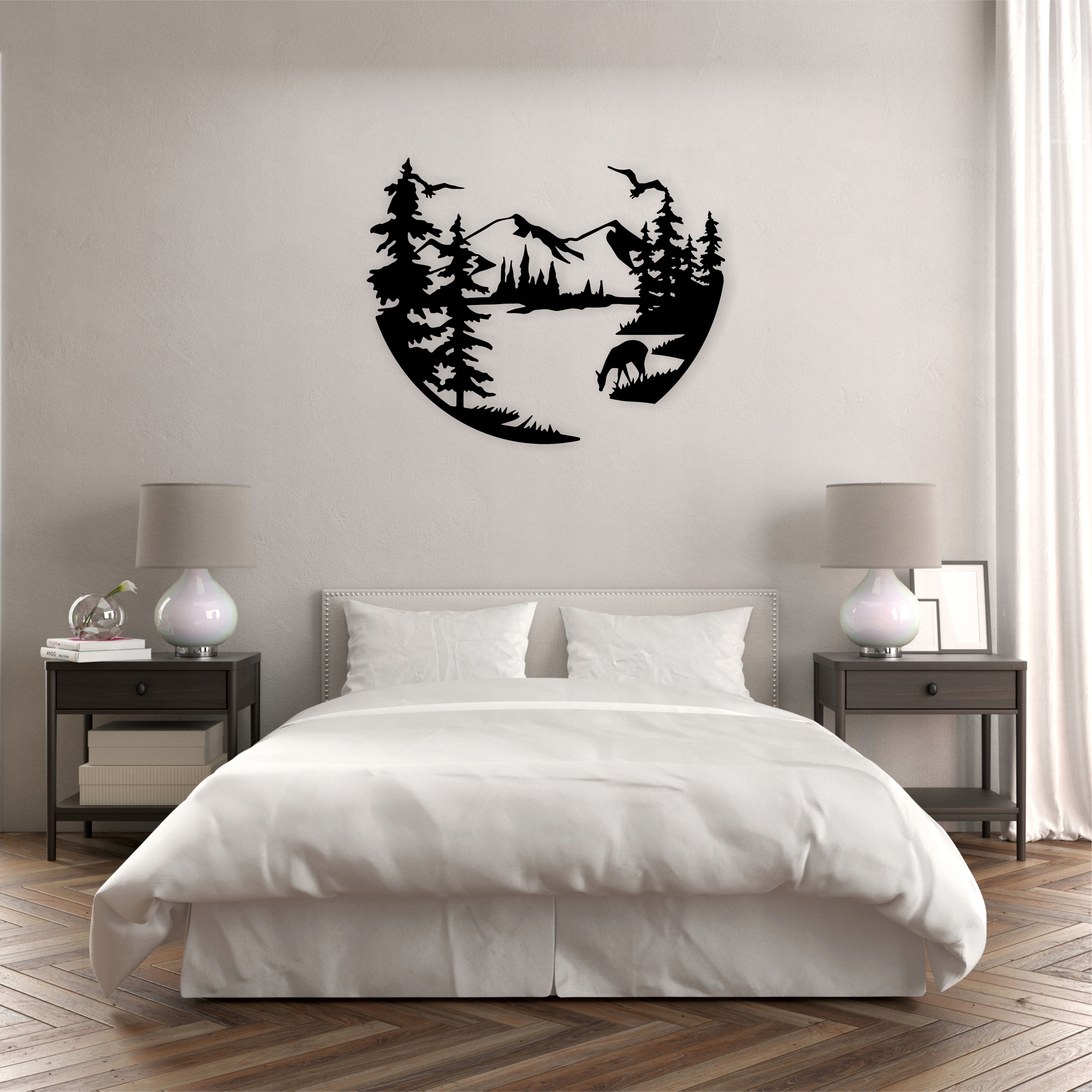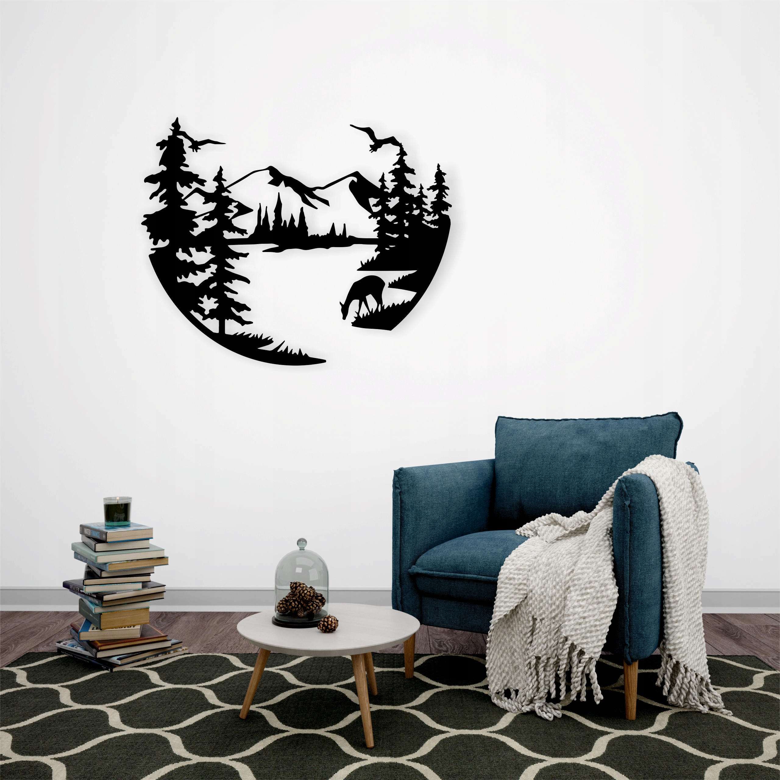 Dekoracja ma charakter leśnej, spokojnej panoramy – idealna do wnętrz rustykalnych, górskich lub inspirowanych naturą